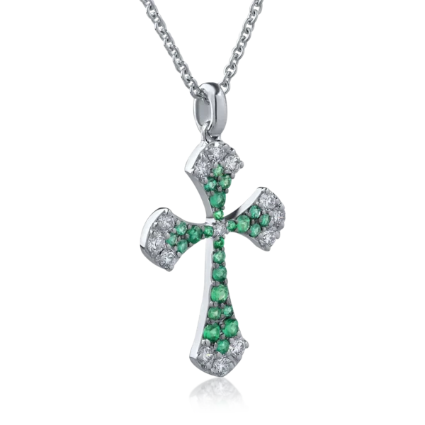 Lant cu pandantiv cruce din aur alb cu diamante de 0.42ct si smaralde de 0.31ct