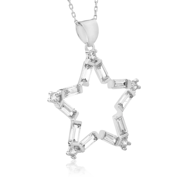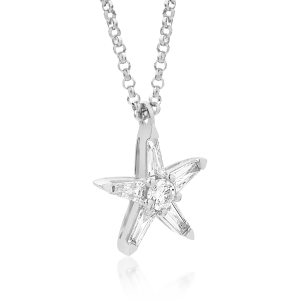 Lant cu pandantiv steluta din aur alb cu diamante baguette si rotunde de 0.27ct
