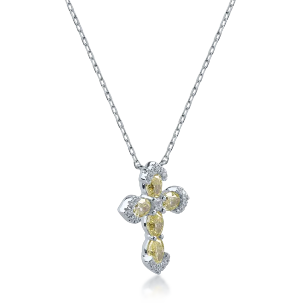 Lant cu pandantiv cruce din aur alb cu diamante galbene ovale de 1.25ct si diamante incolore princess si rotunde de 0.13ct