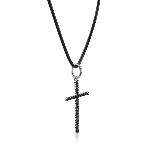 Lant piele cu pandantiv cruce din aur alb cu diamante negre de 0.2ct