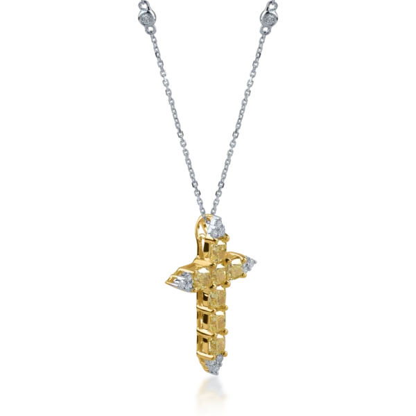Lant cu pandantiv cruce din aur alb-galben cu diamante cushion si rotunde de 2.78ct