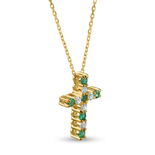 Lant cu pandantiv cruce din aur galben cu diamante de 0.1ct si smaralde de 0.1ct