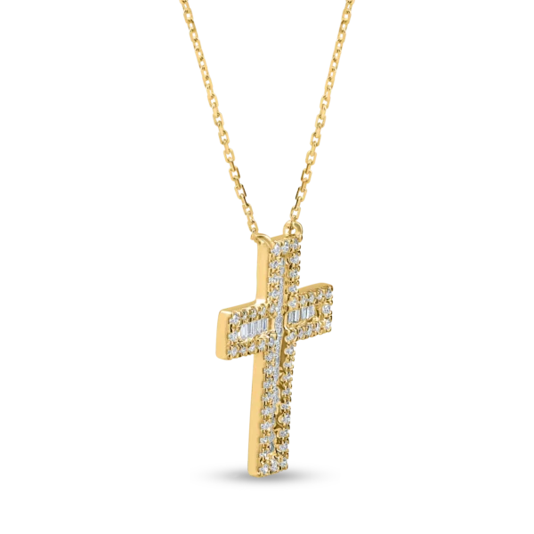 Lant cu pandantiv cruce din aur galben cu diamante baguette si rotunde de 0.4ct