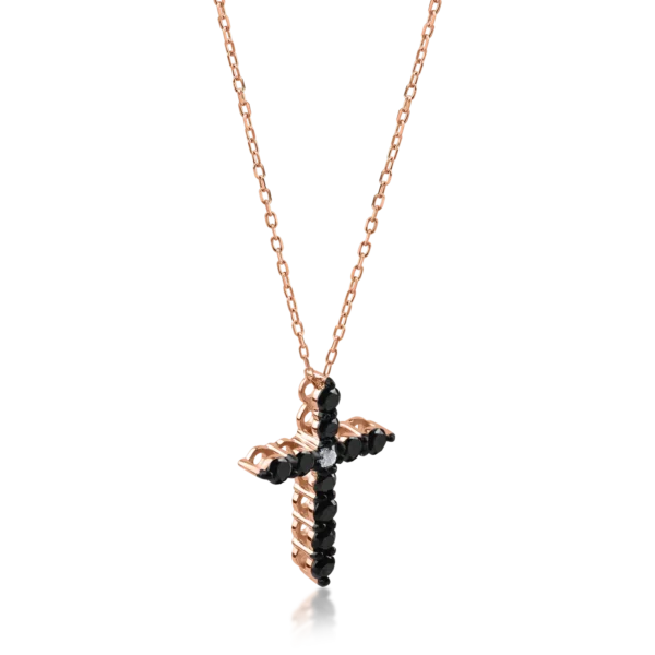 Lant cu pandantiv cruce din aur roz cu diamant incolor de 0.02ct si diamante negre de 0.2ct