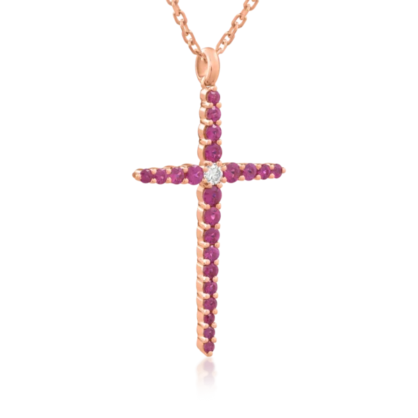 Lant cu pandantiv cruce din aur roz cu diamant de 0.09ct si rubine de 1.08ct