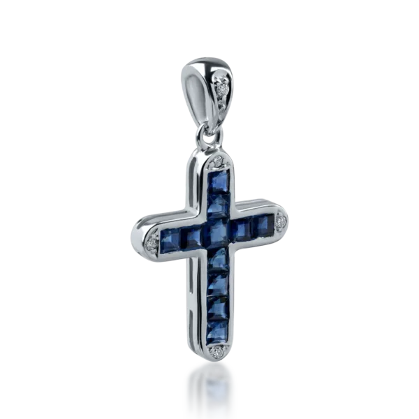 Pandantiv cruce din aur alb cu safire rectangulare de 0.6ct si diamante de 0.03ct