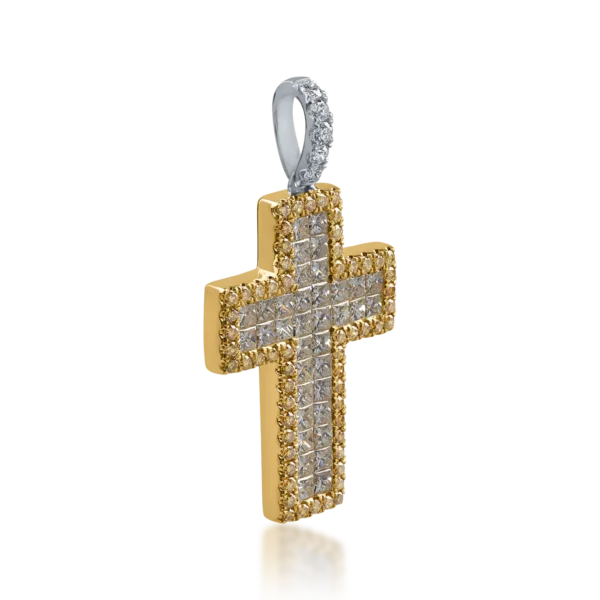 Pandantiv cruce din aur alb-galben cu diamante galbene princess si rotunde de 1.69ct si diamante incolore de 0.1ct