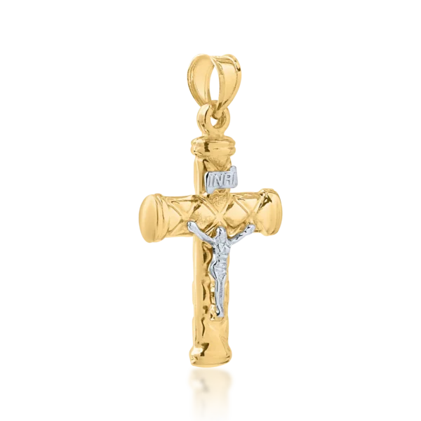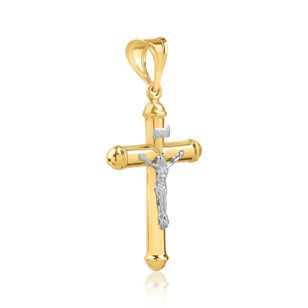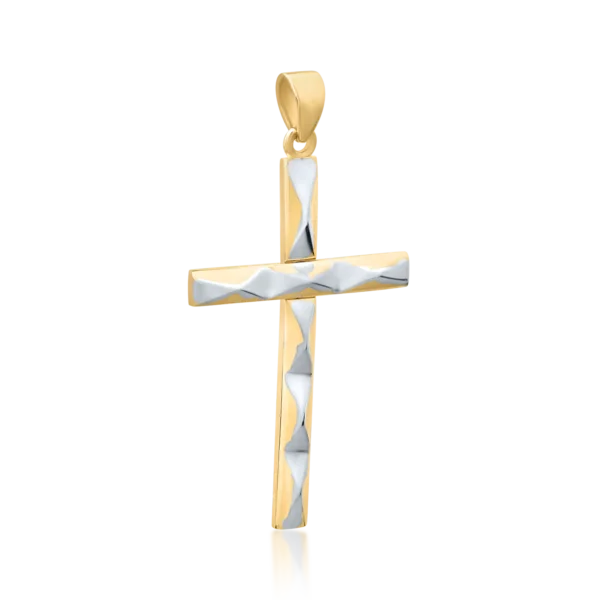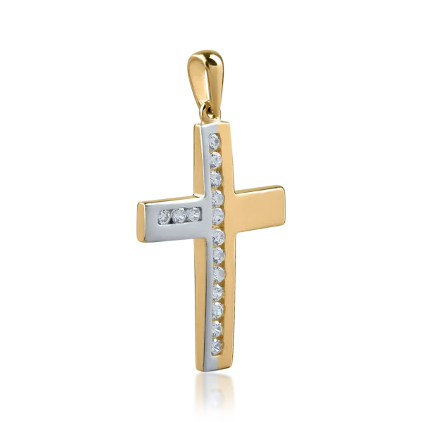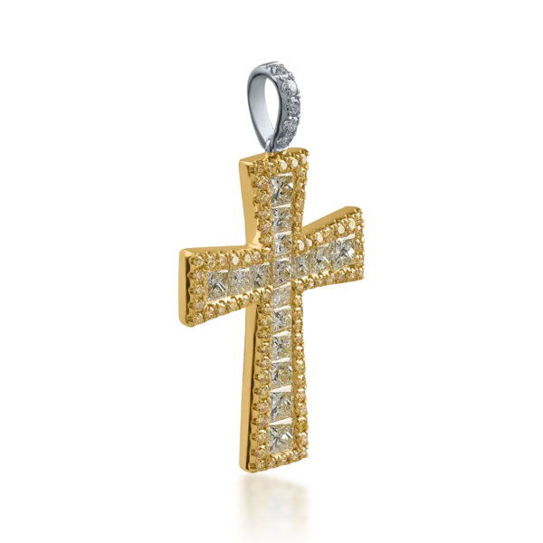 Pandantiv cruce din aur alb-galben cu diamante galbene princess si rotunde de 2.5ct si diamante incolore de 0.08ct