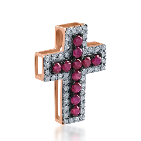 Pandantiv cruce din aur roz cu rubine de 0.287ct si diamante de 0.121ct