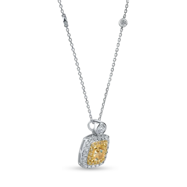 Lant cu pandantiv patrat din aur alb-galben cu diamante galbene galbene cushion si rotunde si diamante incolore de 1.3ct