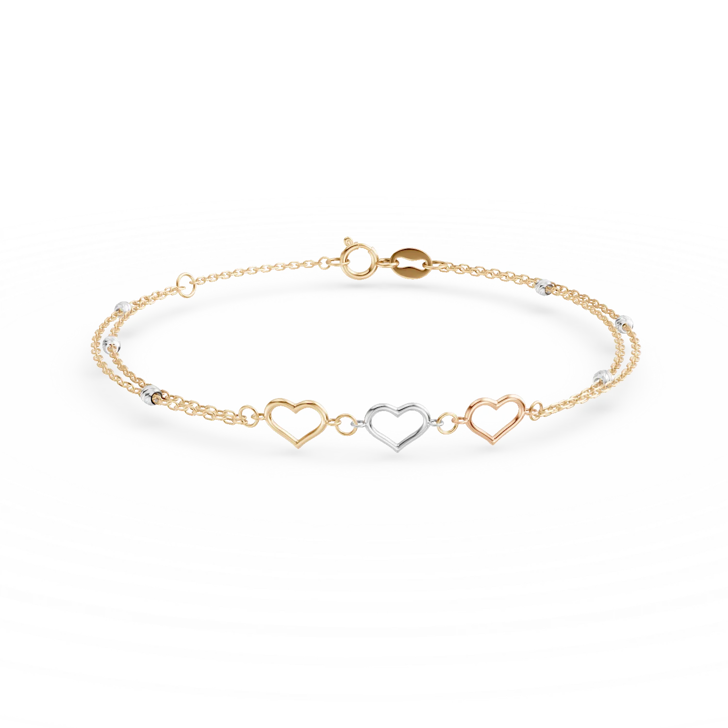 Bijuteriile din aur sunt intotdeauna o alegere potrivita. Culoarea metalului pretios si designul simetric al bratarii cu inimioare din aur alb-roz-galben se imbina intr-o asociere de forme si contururi. TEILOR este despre tine si universul tau de straluciri intense!