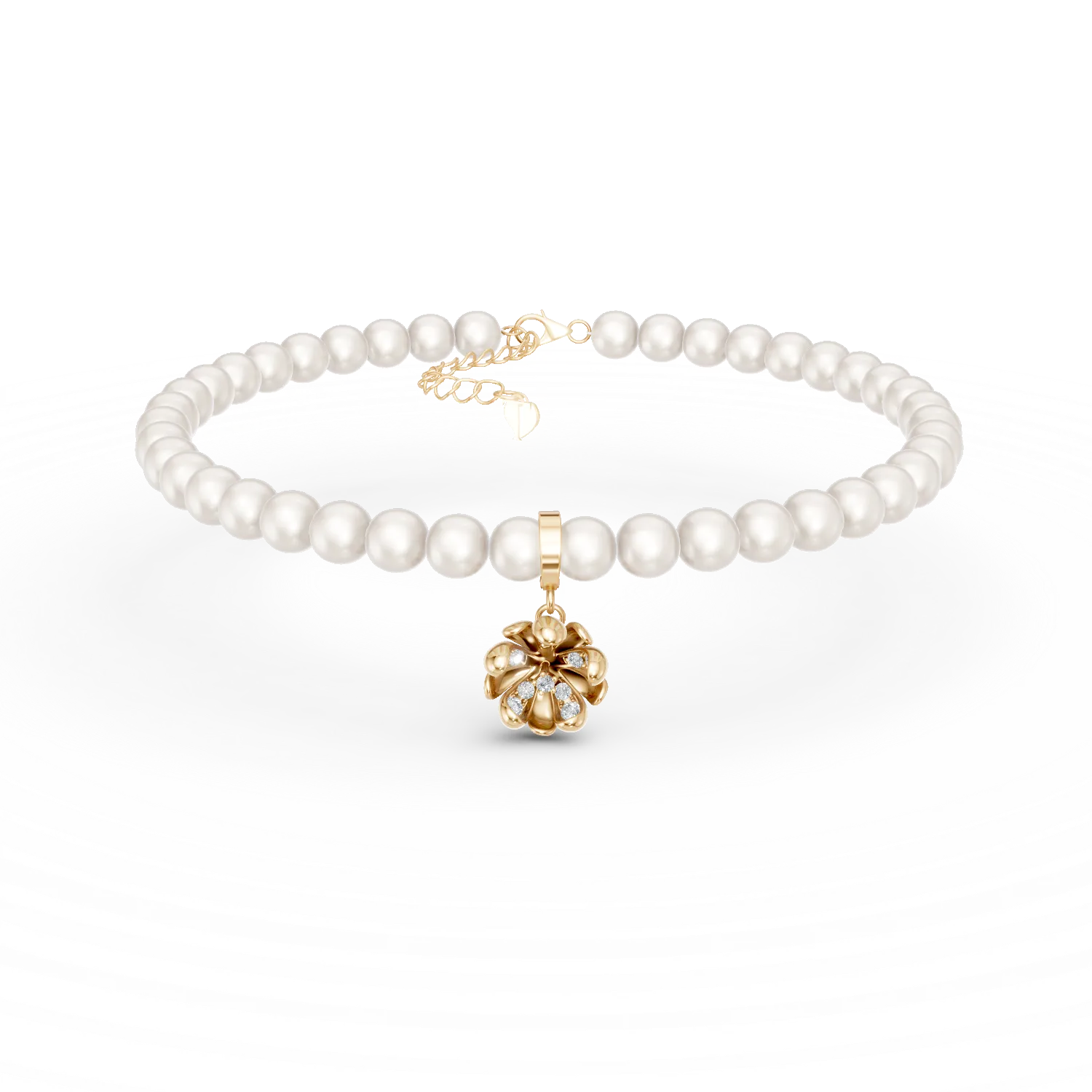 Bratara cu pandantiv floare de tei din aur galben cu diamante de 0.08ct si perle de cultura