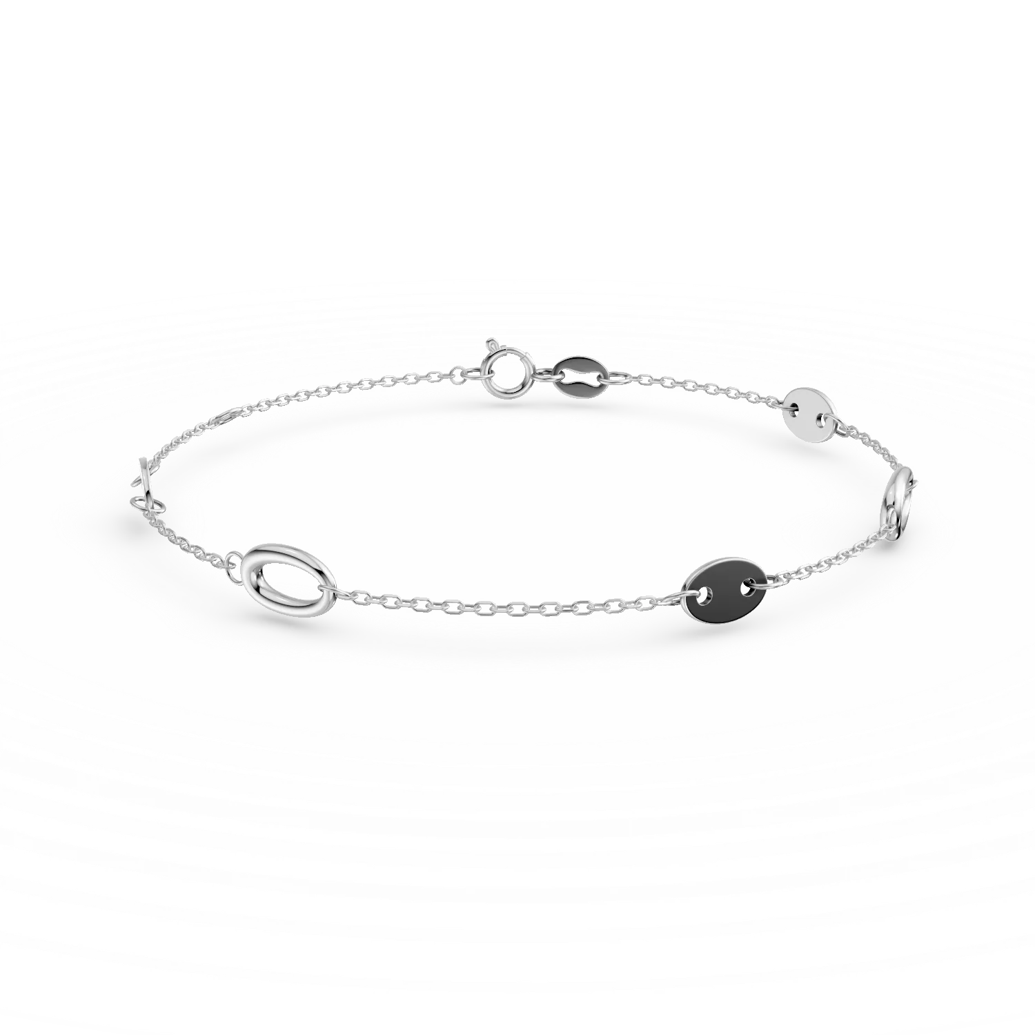 Bijuteriile din aur sunt intotdeauna o alegere potrivita. Culoarea metalului pretios si designul simetric al bratarii din aur alb cu pandantive geometrice se imbina intr-o asociere de forme si contururi. Poarta accesoriile care te caracterizeaza si gaseste-ti inspiratia cu TEILOR.