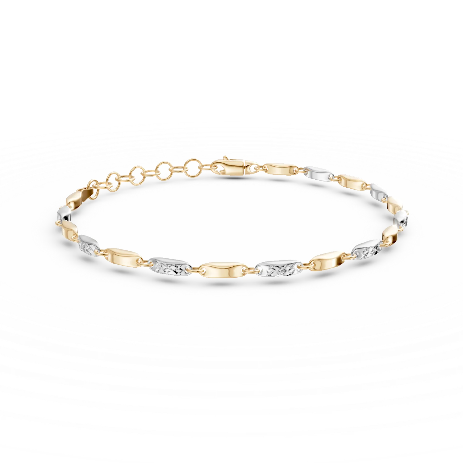 Bijuteriile din aur sunt intotdeauna o alegere potrivita. Culoarea metalului pretios si designul simetric al acestei bratari din aur alb-galben se imbina intr-o asociere de forme si contururi. Alege accesoriile care transmit mai mult decat cuvintele.
