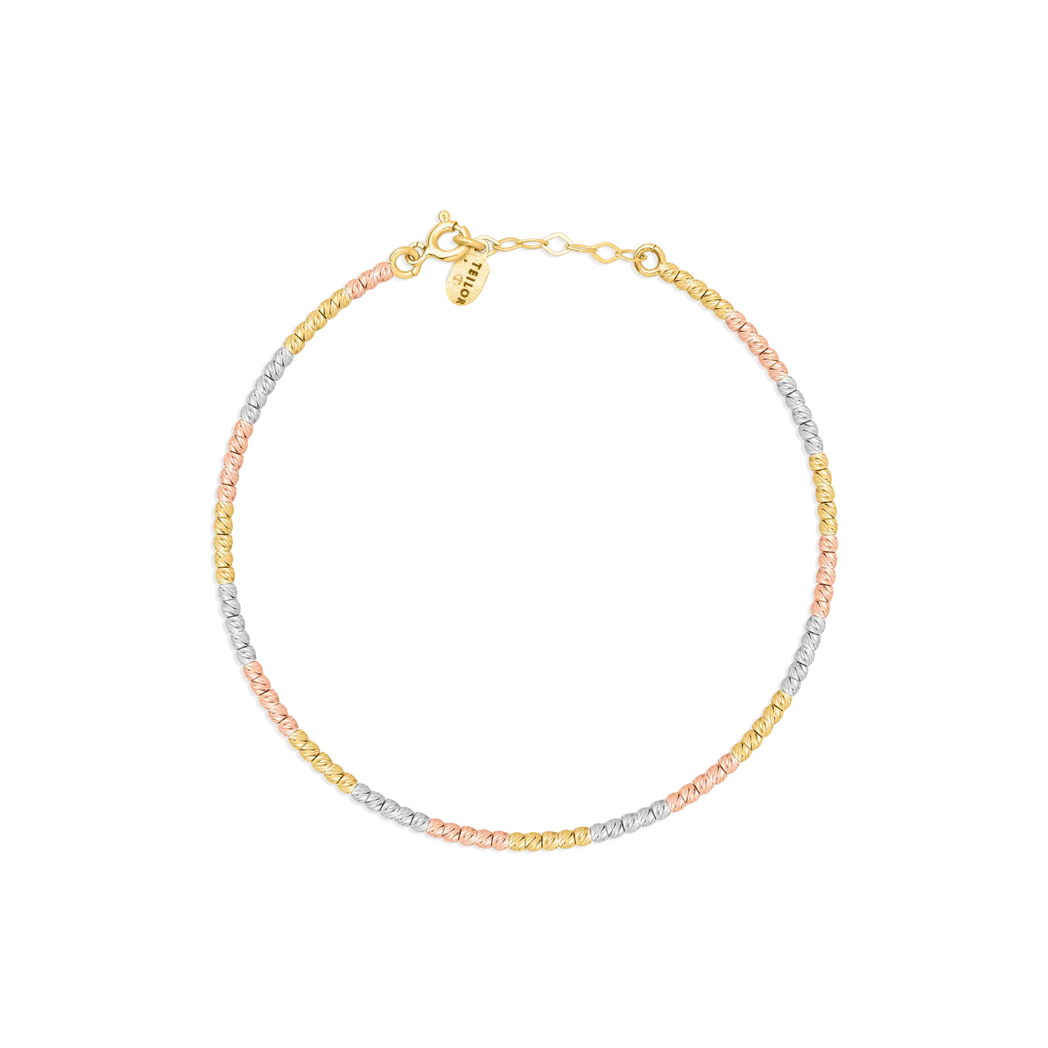 Bijuteriile din aur sunt intotdeauna o alegere potrivita. Designul delicat al bratarii din aur alb-roz-galben exprima simplu seninatatea si frumusetea ta. TEILOR te inspira sa iti creezi de fiecare data o aparitie memorabila.