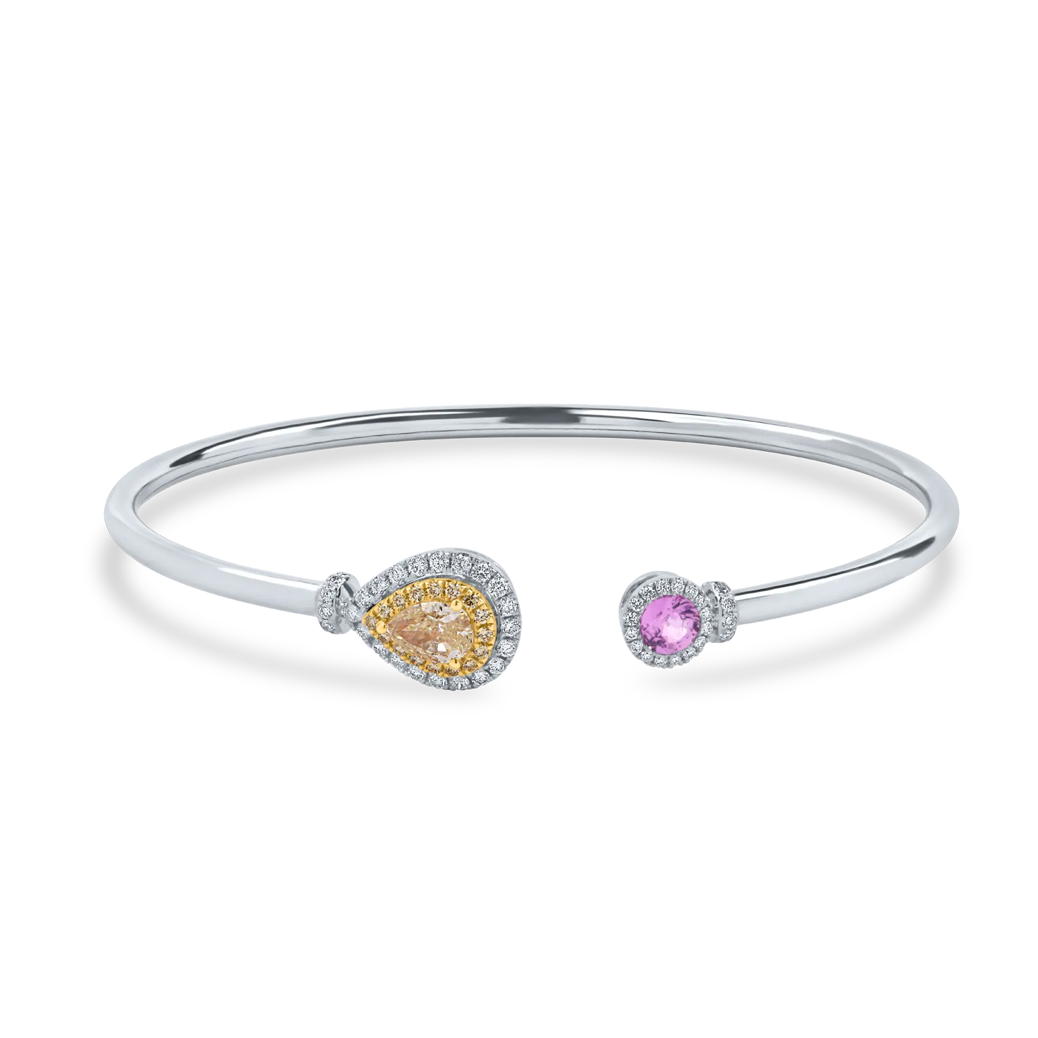 Bratara fixa deschisa din aur alb cu diamante fancy galbene pear si safir roz de 1.3ct