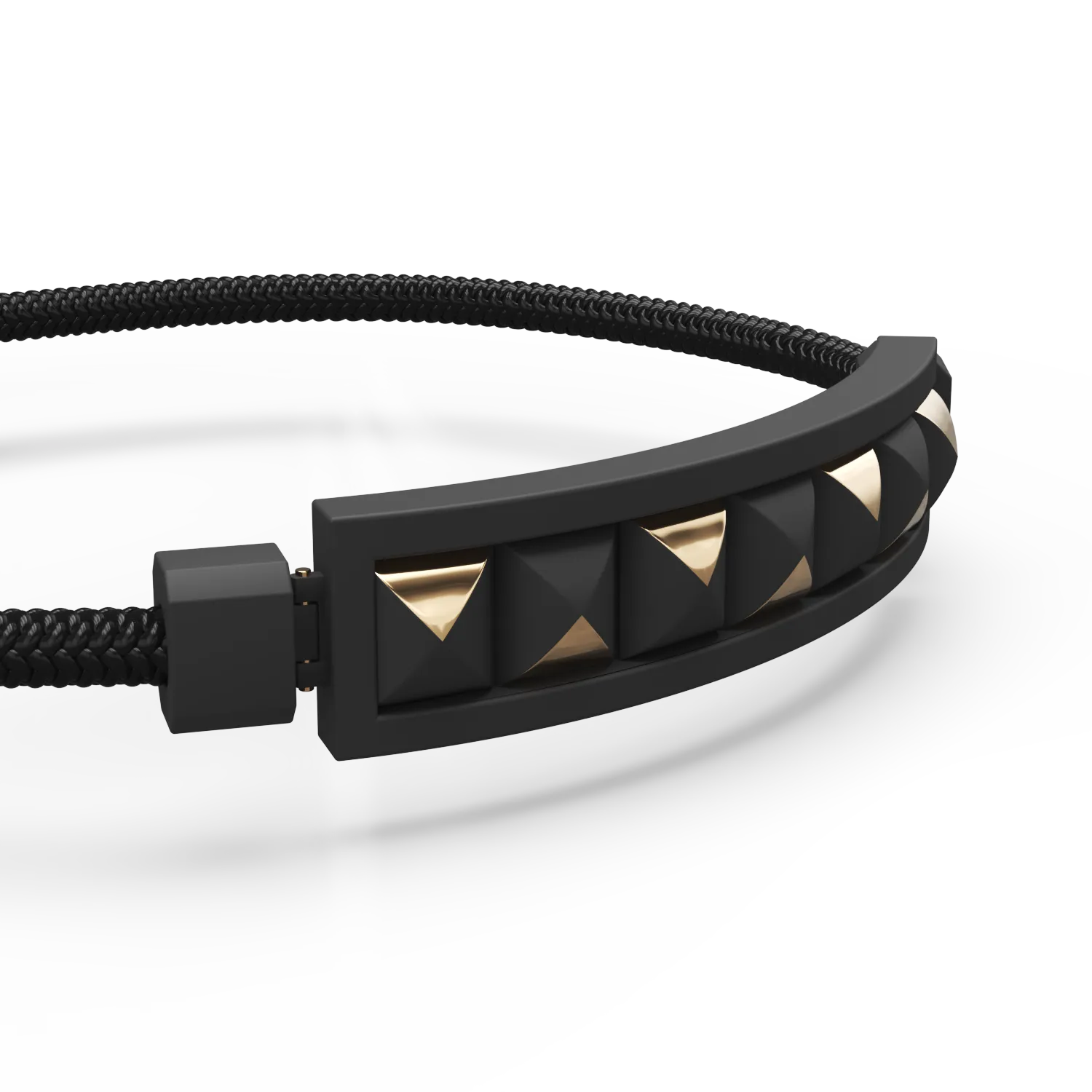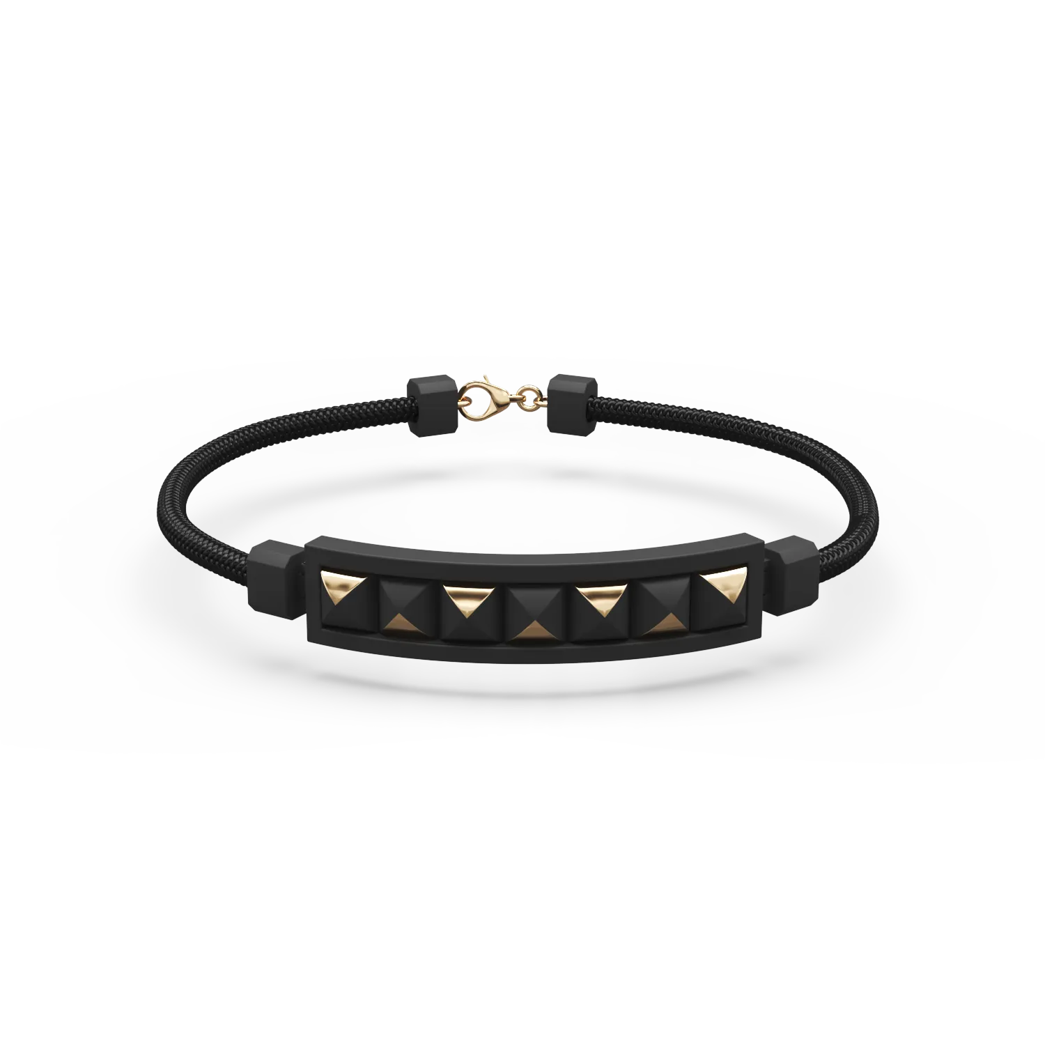 Versatilitatea bijuteriilor din colectia FLIGHT este o dovada a modernitatii sale. Asemenea bratarii din titan si aur galben cu cord de piele – un echilibru intre mister, minimalism si masculin, finisat de simbolul piramidei – un simbol al arhitecturii universale.