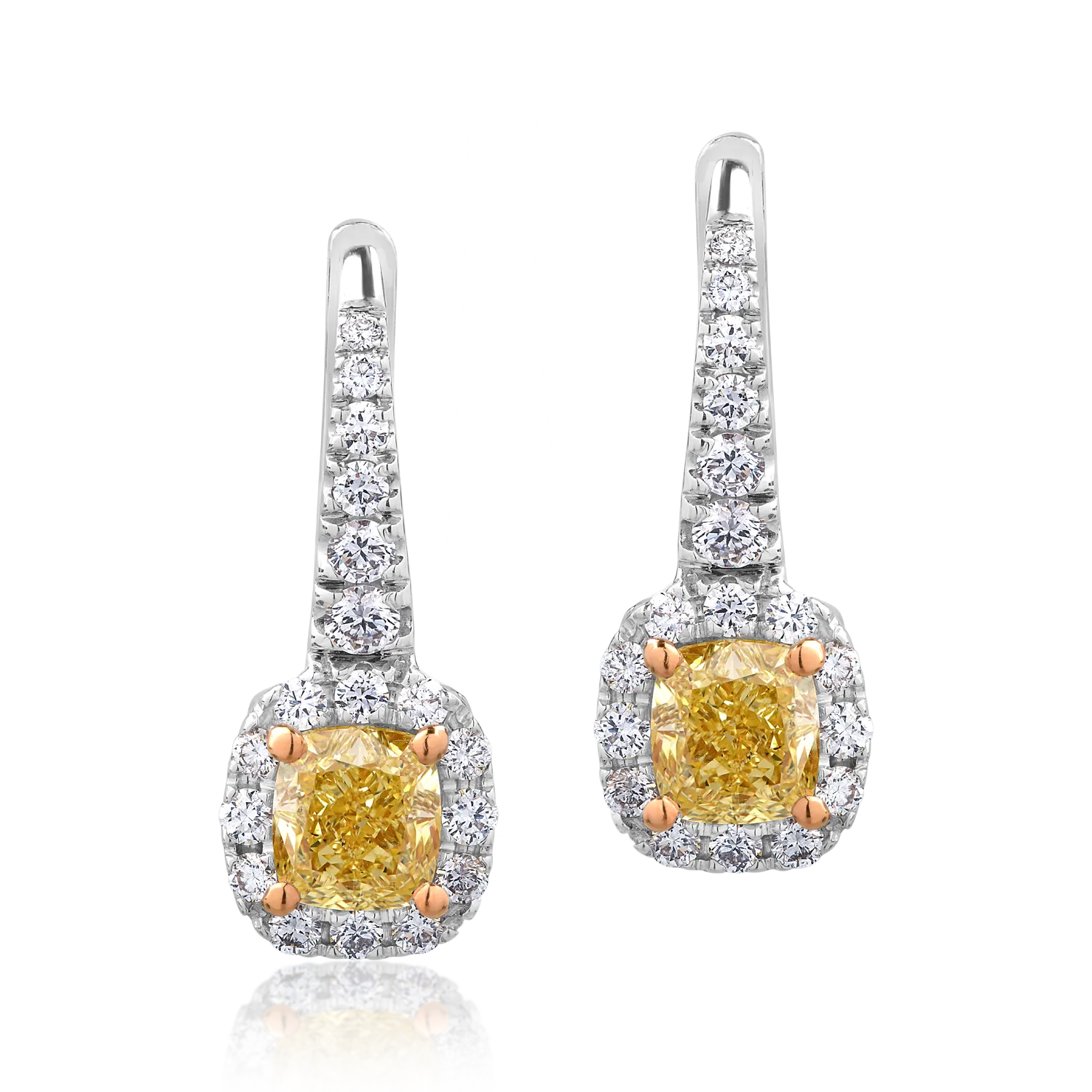 Cercei din aur alb cu diamante fancy-galbene radiant de 1.19ct si diamante incolore round de 0.52ct