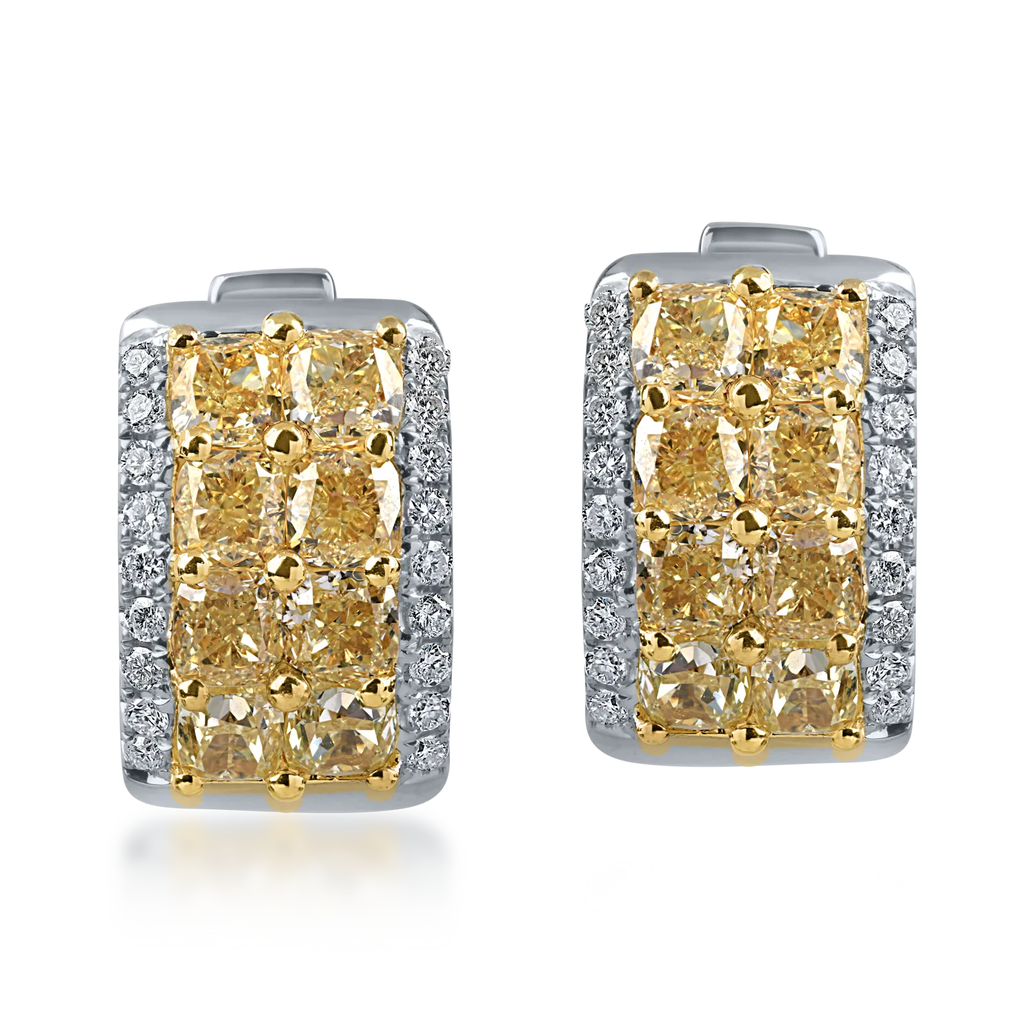 Cercei din aur alb cu diamante galbene cushion si incolore round de 3.5ct