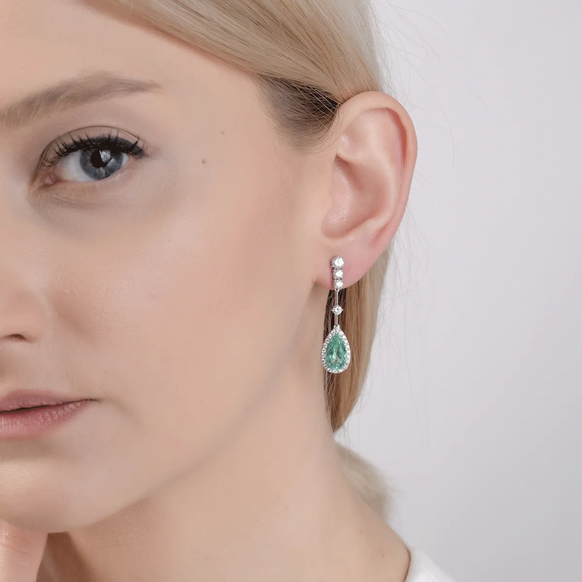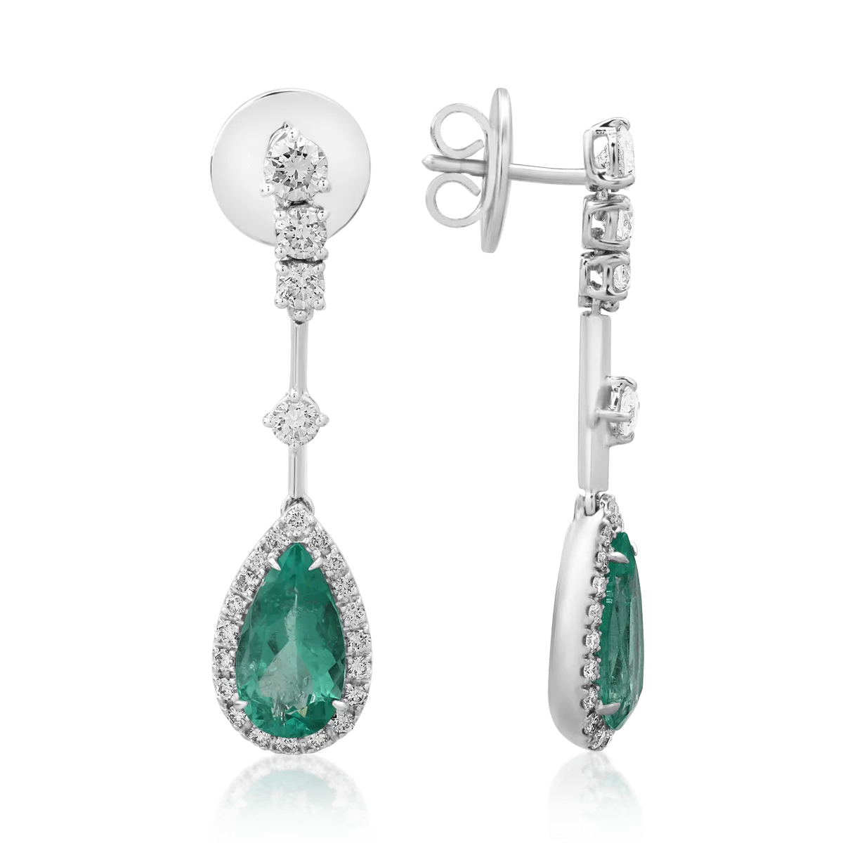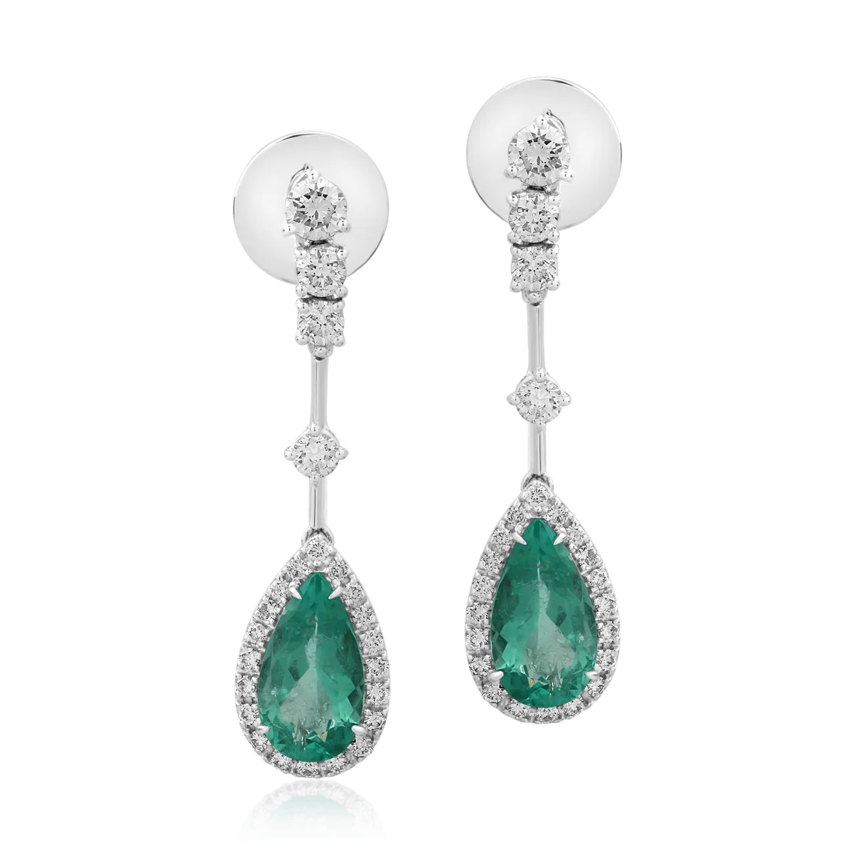 Cercei din aur alb cu smaralde pear de 3.51ct si diamante round de 1.34ct