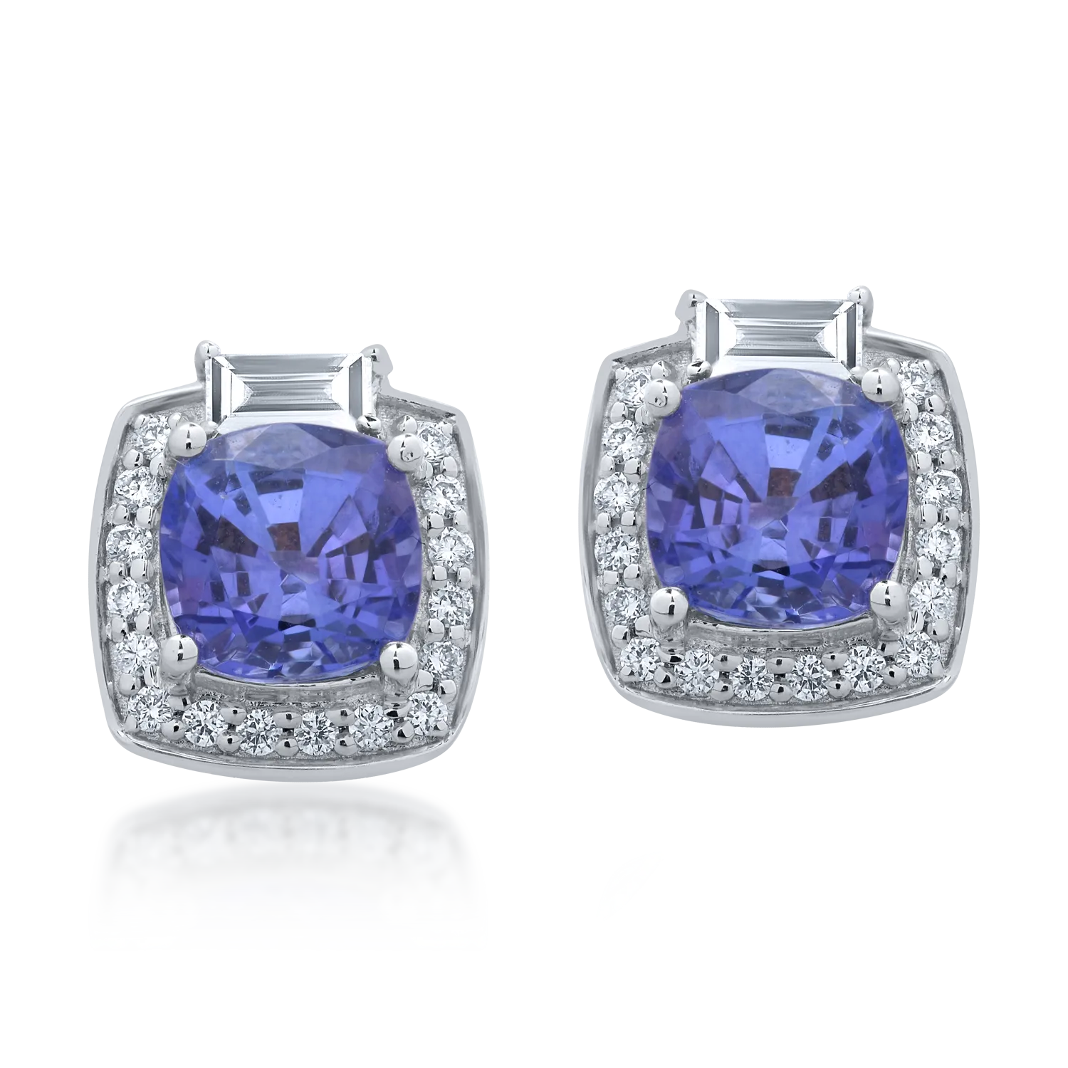Cercei din aur alb cu tanzanite cushion de 2.2ct si diamante baguette si rotunde de 0.367ct