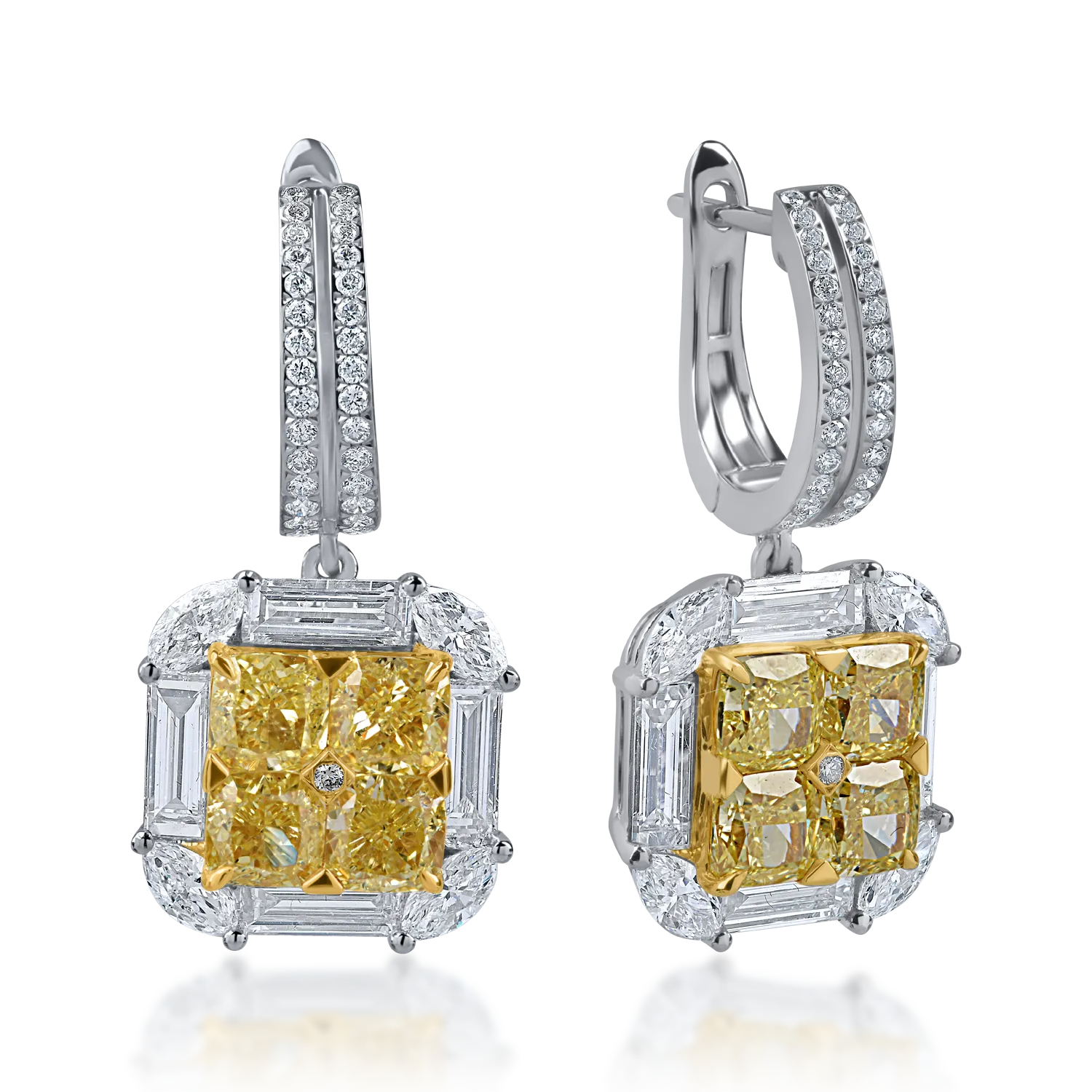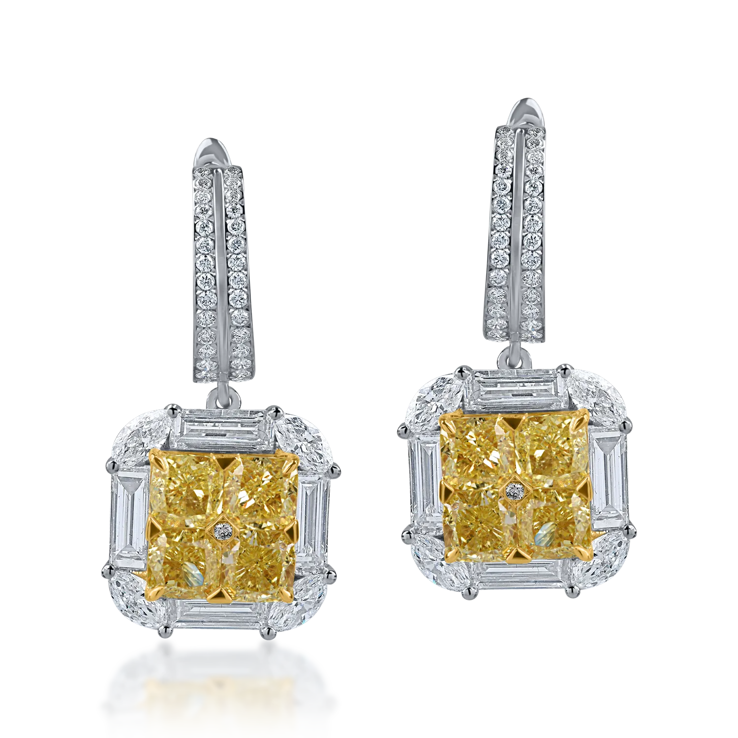 Cercei din aur alb-galben cu diamante fancy galbene cushion de 3.7ct si diamante round si baguette de 2.4ct