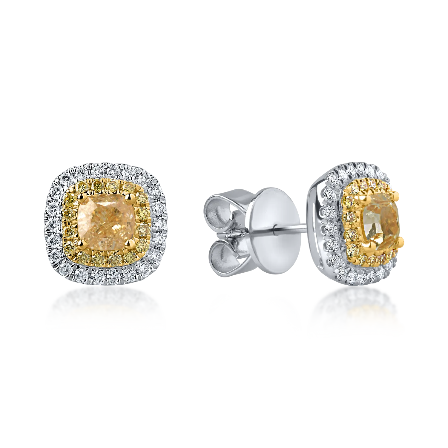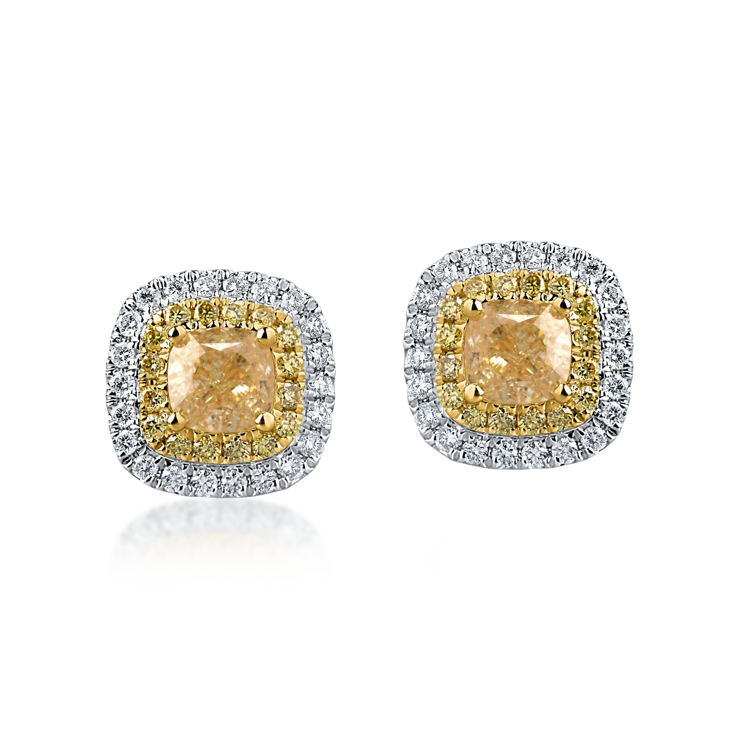 Cercei din aur alb-galben cu diamante galbene cushion si round si diamante incolore de 1.3ct