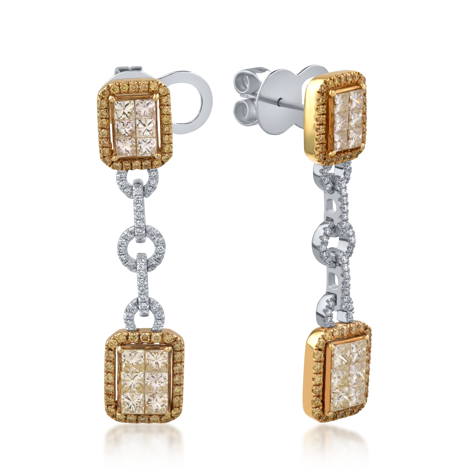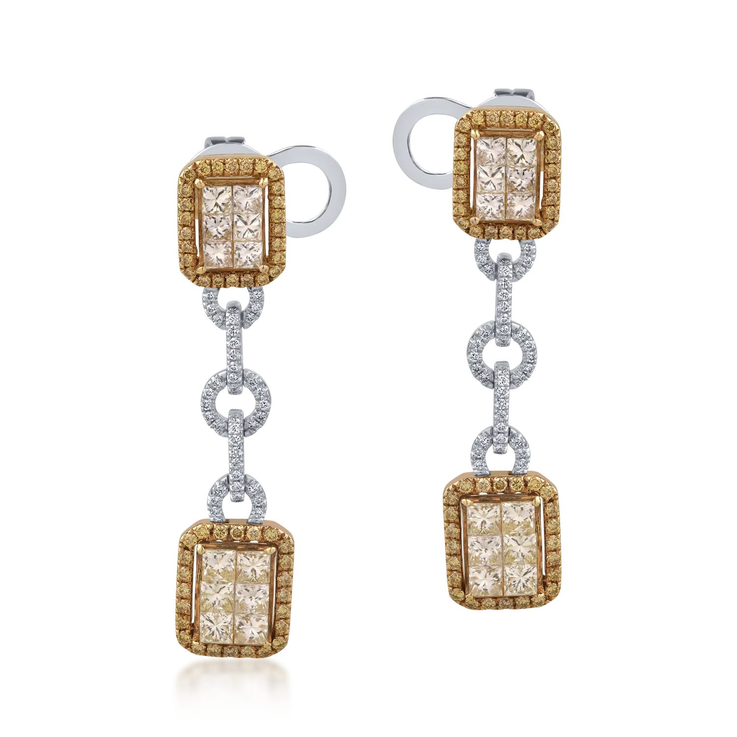 Cercei din aur alb-galben cu diamante round si princess de 2.91ct