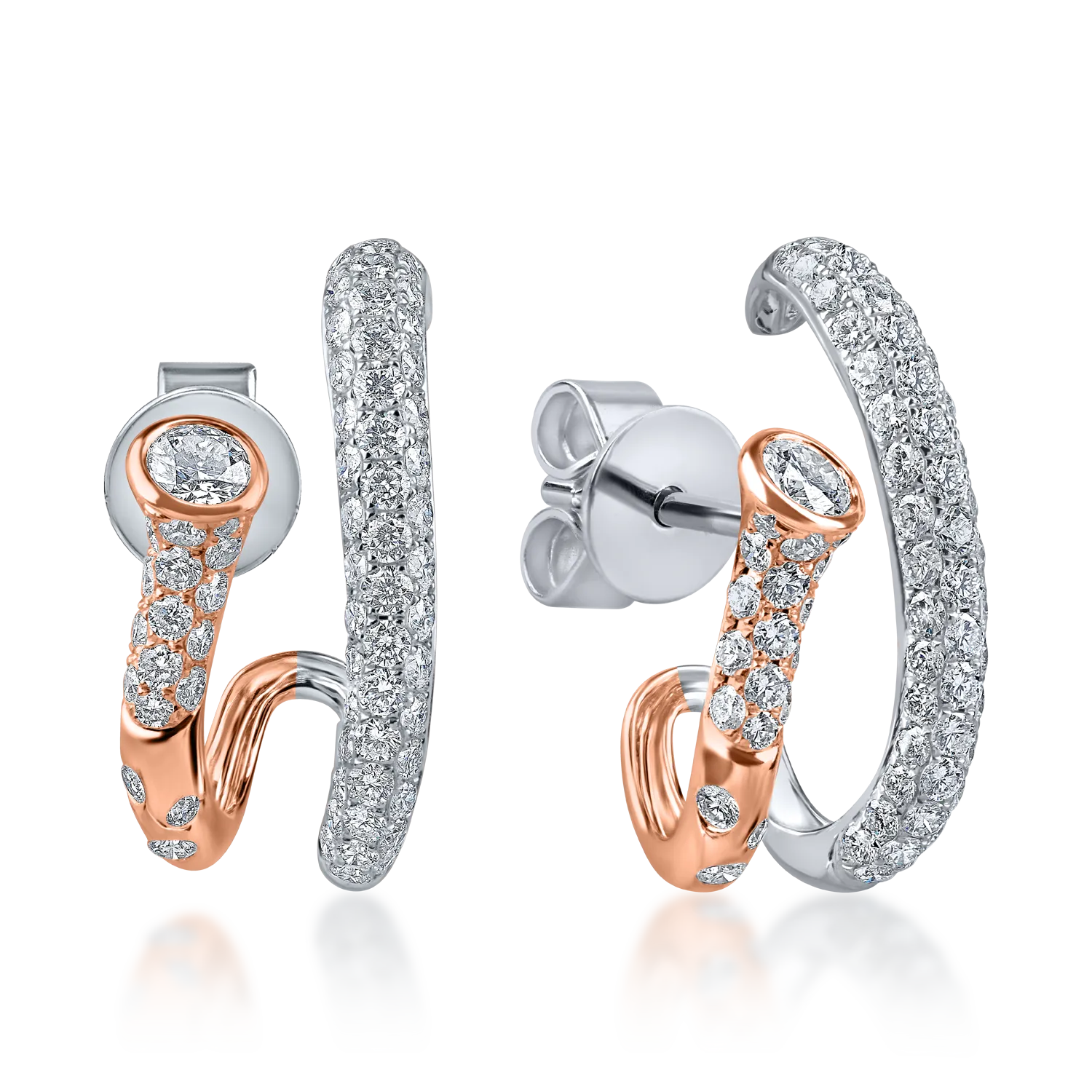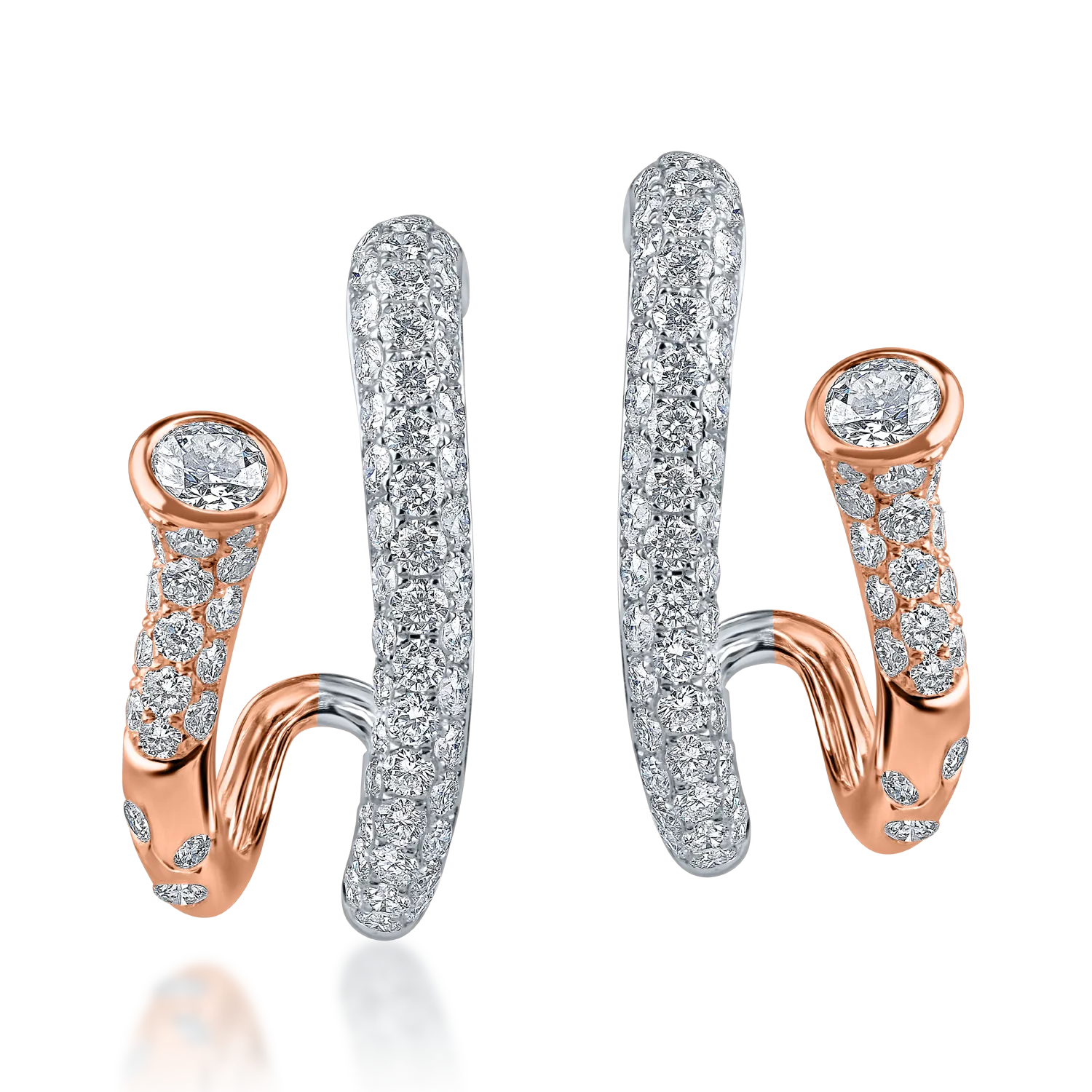 Cerceii din aur alb-roz cu diamante de 2ct aduc impreuna eleganta clasica si designul contemporan. Aurul in doua tonuri pune in valoare diamantele, pentru un look rafinat si indraznet in acelasi timp. Poarta-i cu incredere si descopera colectiile TEILOR.