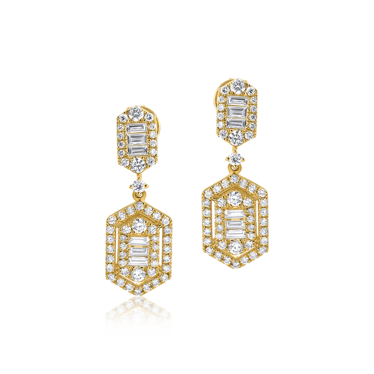 Cercei din aur galben cu diamante baguette si rotunde de 1.2ct