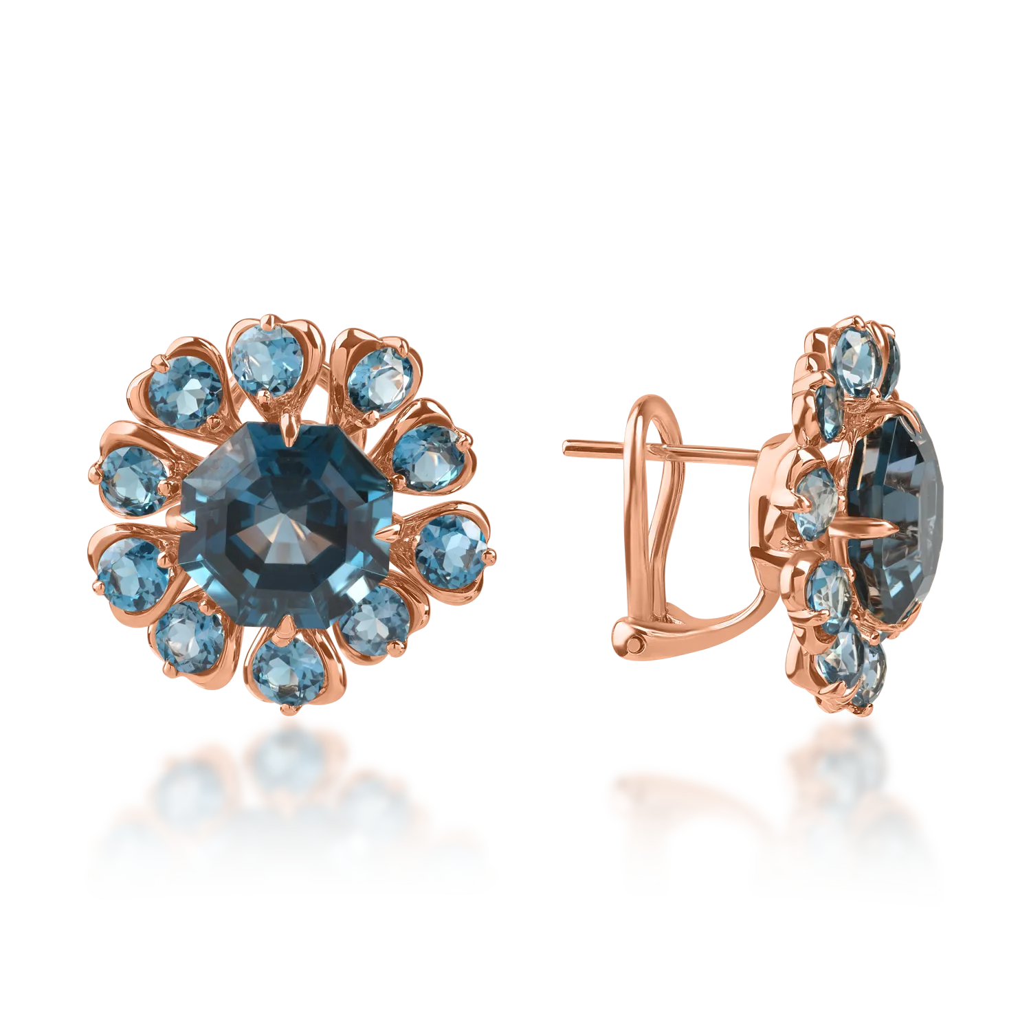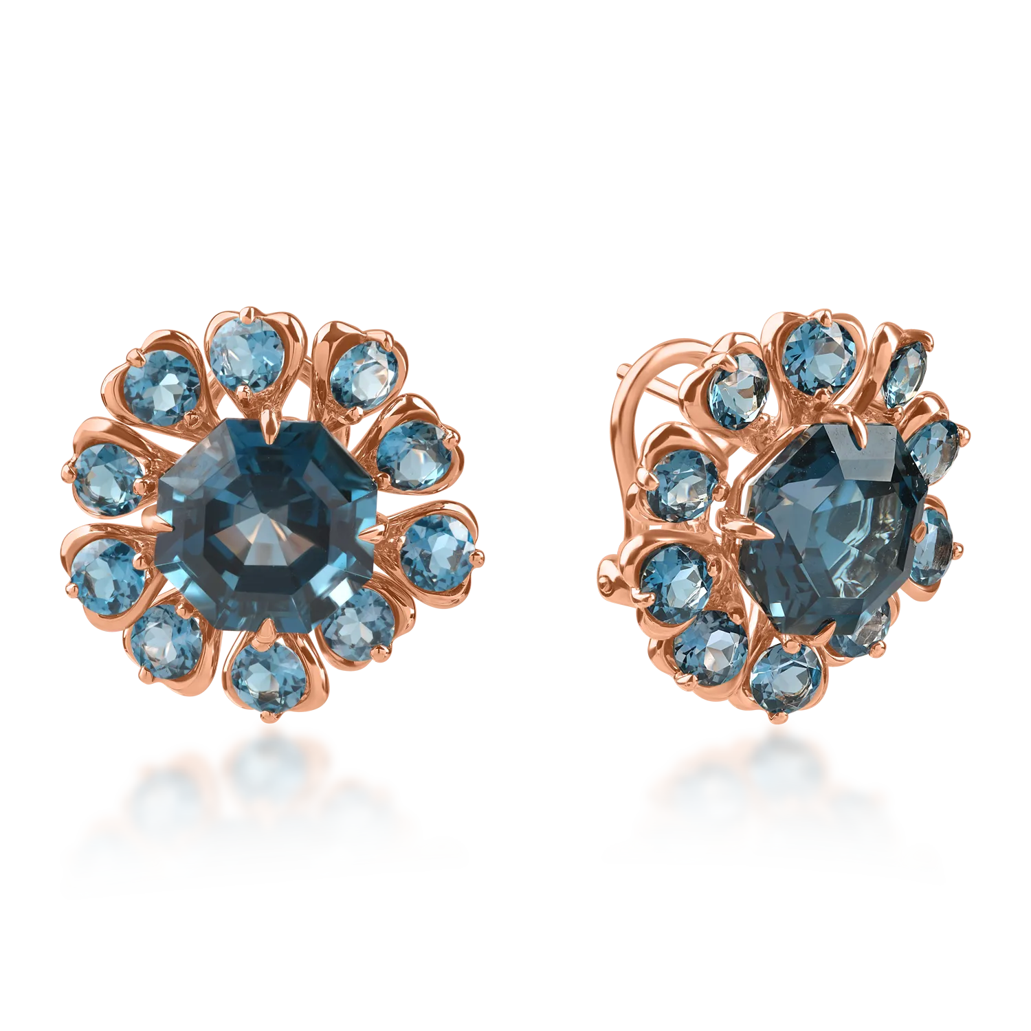 Cercei din aur roz cu topaze london blue octogonale si rotunde de 14.9ct