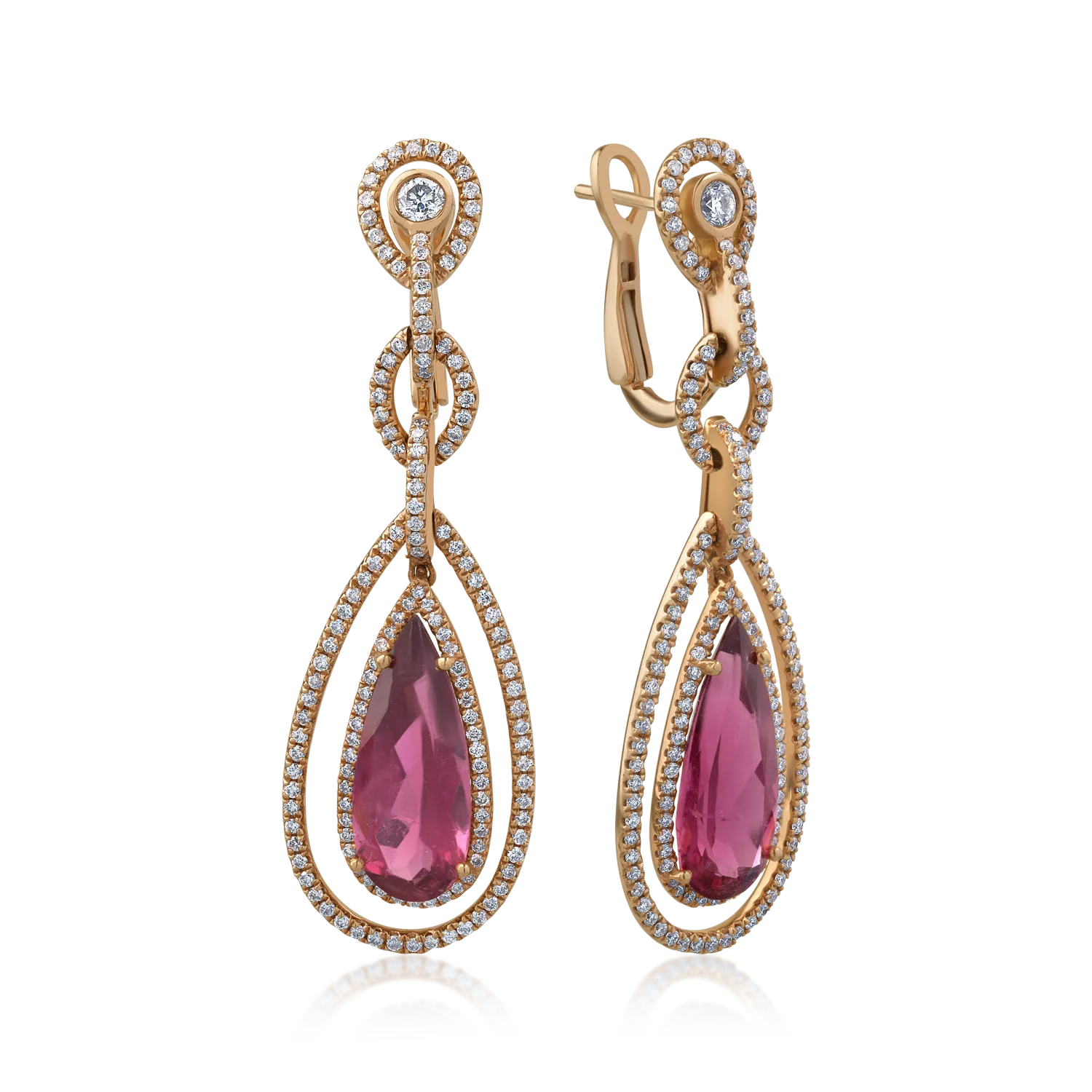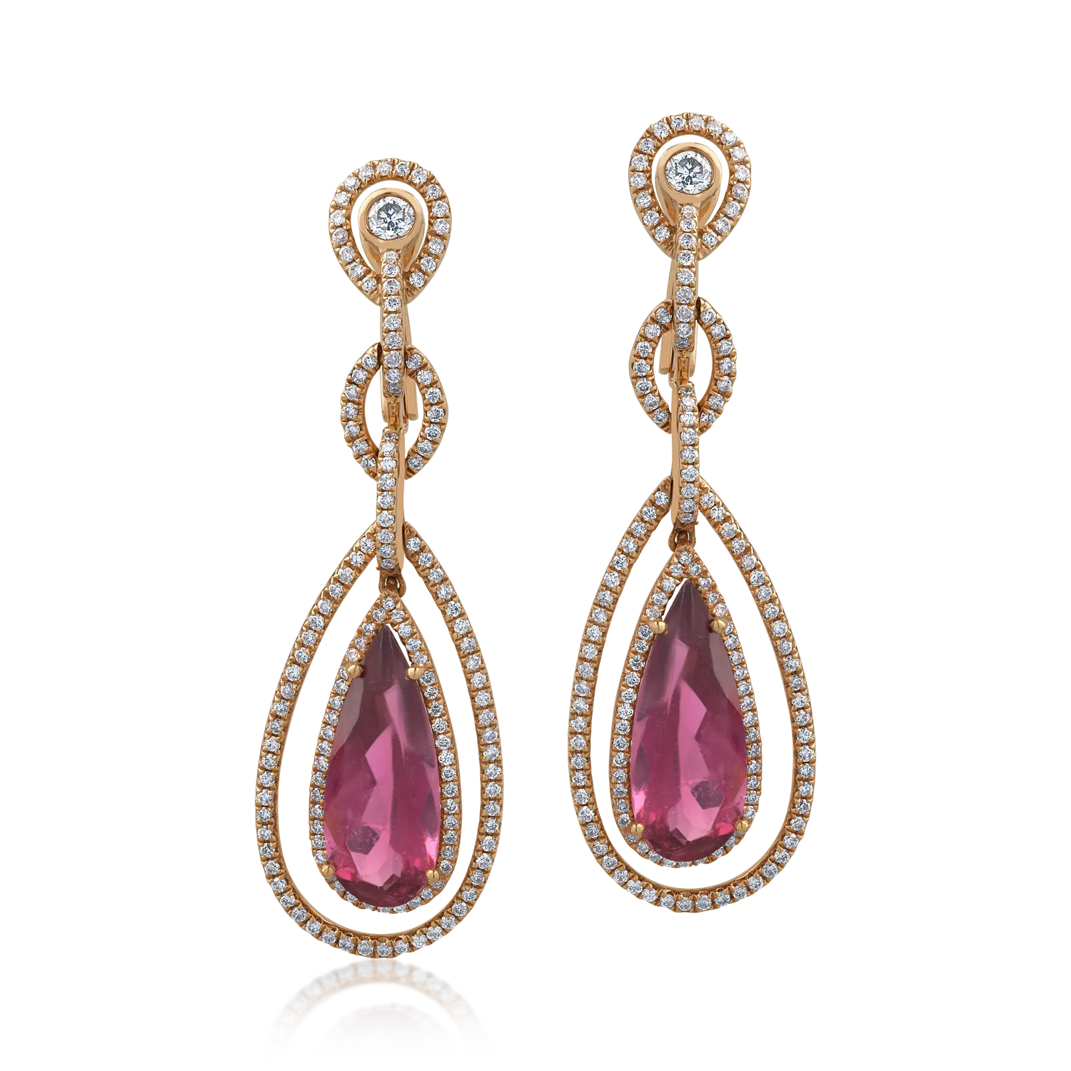 Cercei din aur roz cu turmaline roz pear de 6.7ct si diamante round de 1.27ct