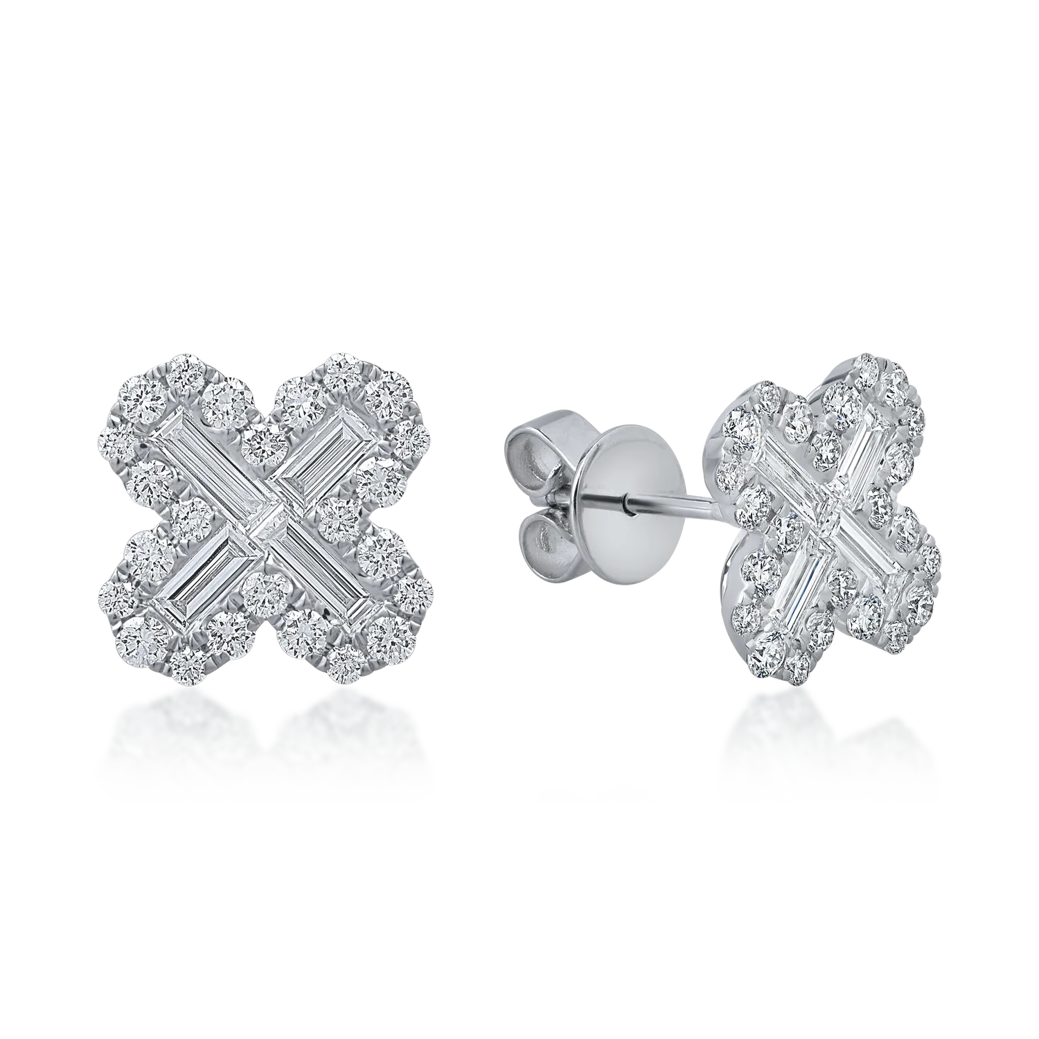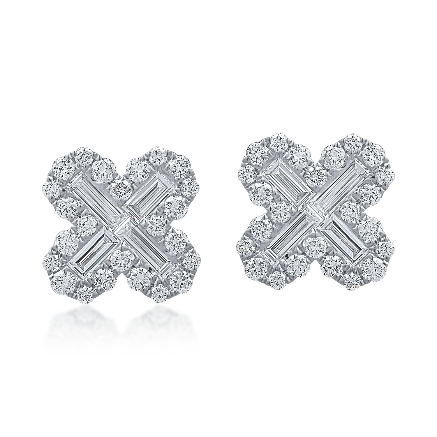 Cercei floare din aur alb cu diamante baguette si rotunde de 1.1ct