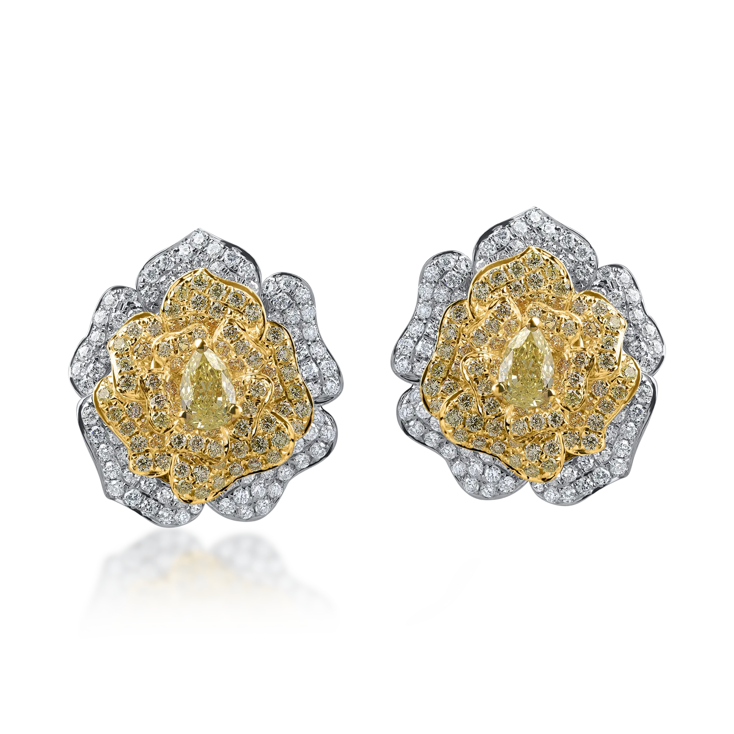 Cercei floare din aur alb-galben cu diamante galbene si incolore round si pear de 2.6ct