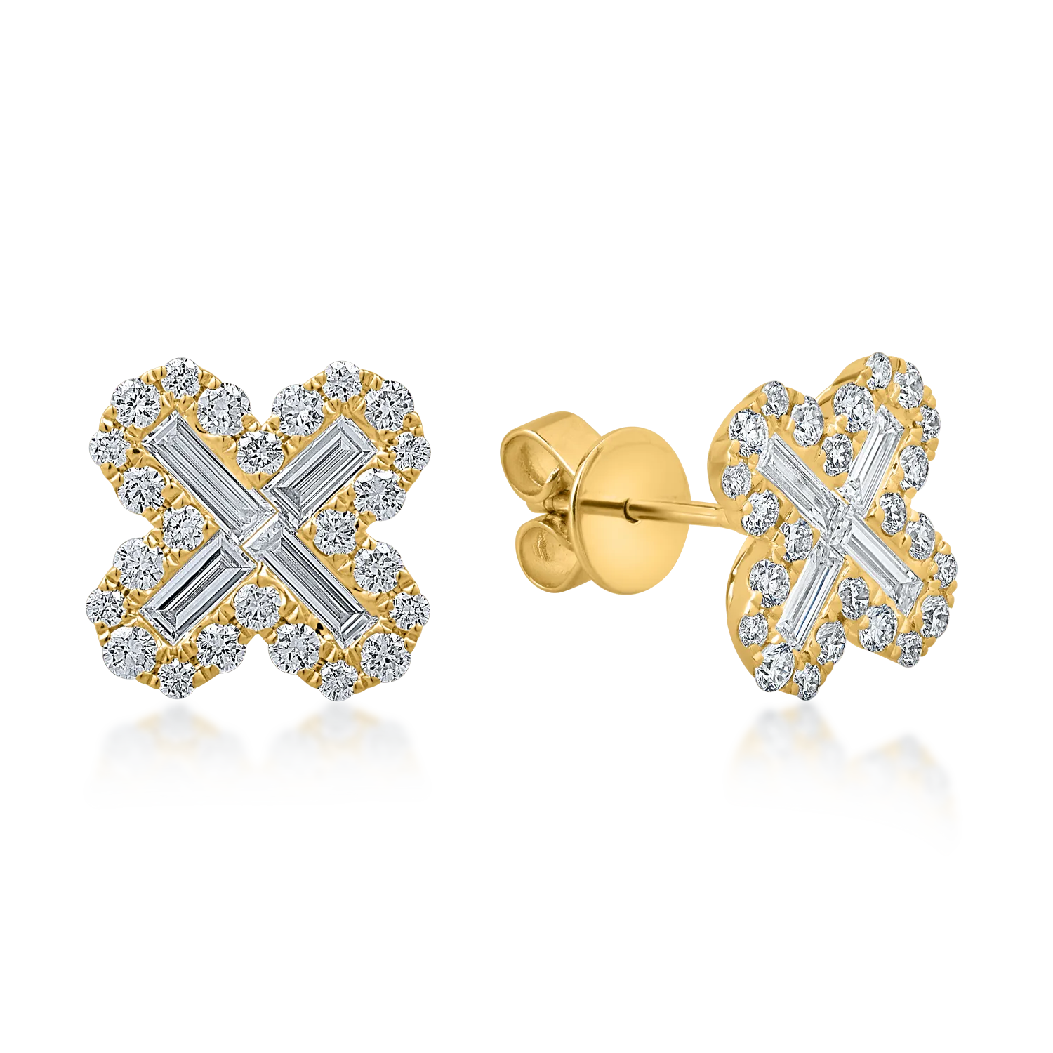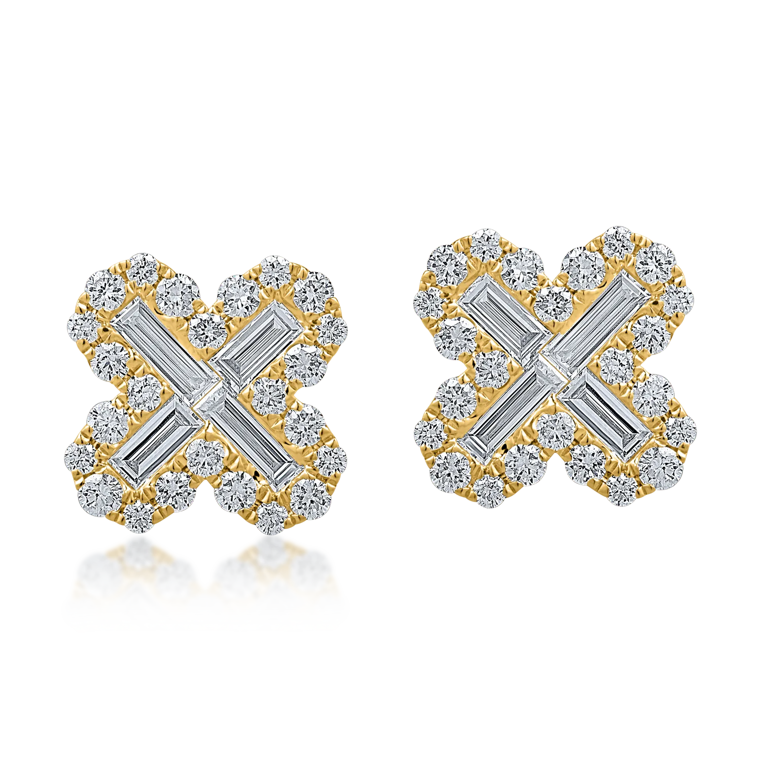 Cercei floare din aur galben cu diamante baguette si rotunde de 1.0ct
