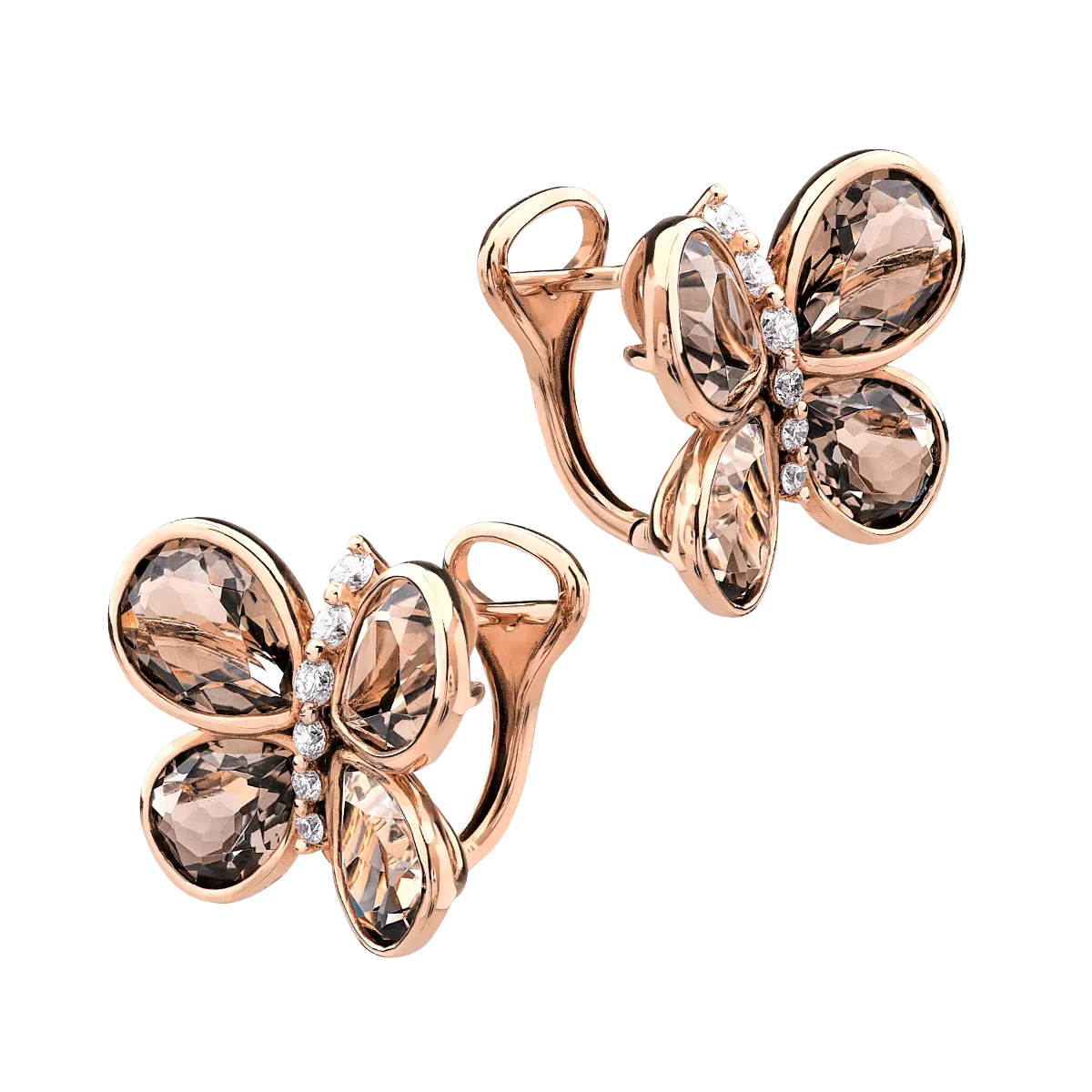 Cercei fluturi din aur roz cu quartz fumuriu pear de 7.865ct si diamante de 0.296ct