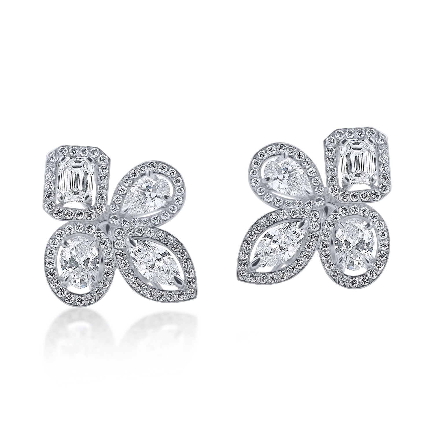 Acesti cercei geometrici din aur alb definesc o estetica moderna, construita in jurul perfectiunii formelor si al echilibrului vizual. Compozitia reuneste diamante de 2.8ct in taieturi emerald, marquise, pear, oval si round, dispuse intr-un aranjament care surprinde prin ritmul si arhitectura sa rafinata. Fiecare piatra reflecta lumina in mod diferit, generand o stralucire complexa, multidirectionala, ce pune in valoare maiestria executiei. Aurul alb sustine puritatea designului si aduce un contrast elegant intre simetrie si fluiditate. O bijuterie spectaculoasa, creata pentru femeia care apreciaza expresiile contemporane ale rafinamentului.