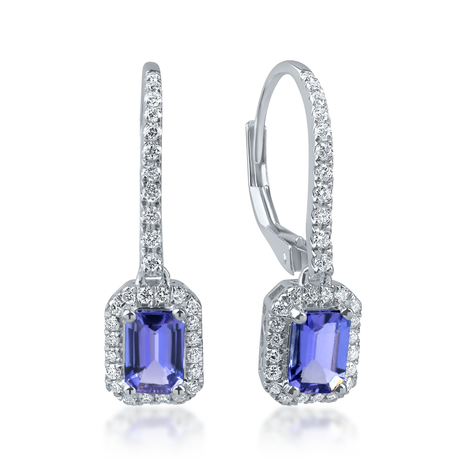 Cercei geometrici din aur alb cu tanzanite rectangulare de 1ct si diamante de 0.3ct