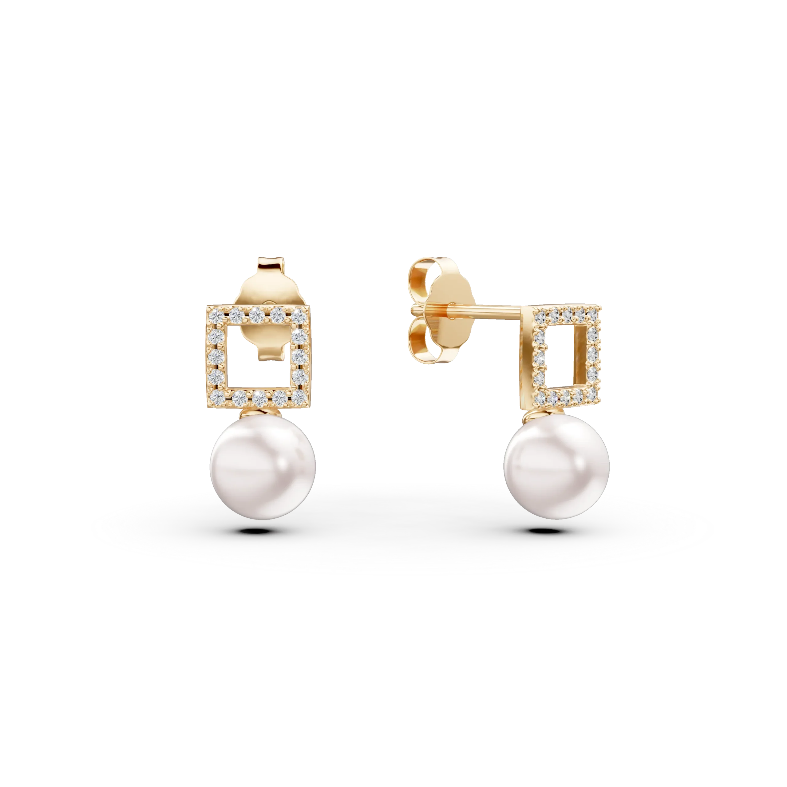 Cercei geometrici din aur galben cu zirconii si perle sintetice