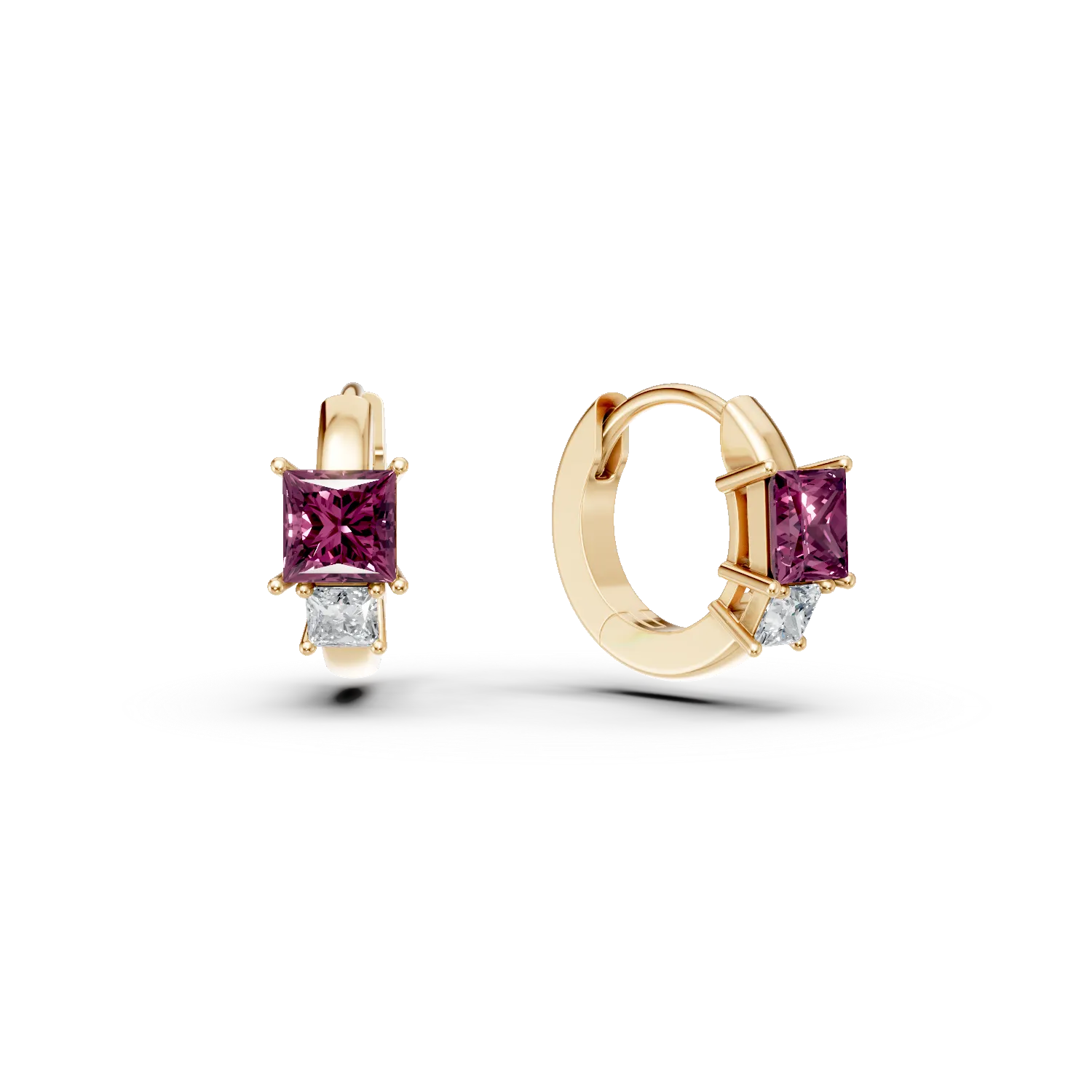 Cercei hoop din aur galben cu rubine square de 0.3ct si diamante de 0.06ct