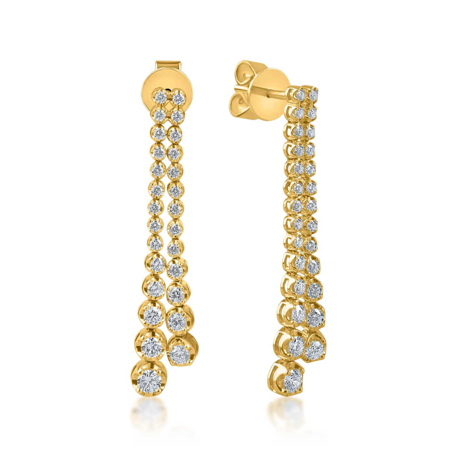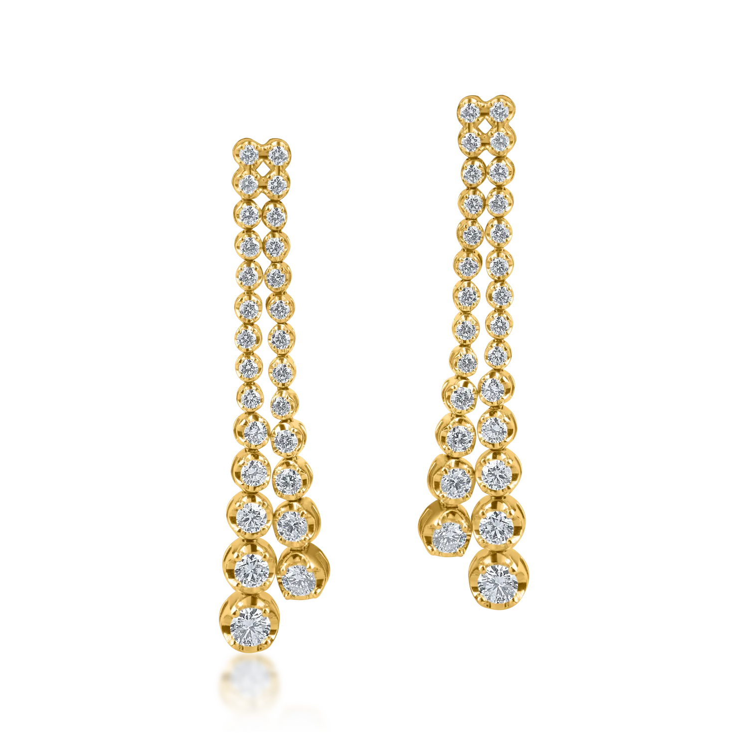 Incearca ceva diferit, alege o bijuterie de impact. Un simbol al femeii moderne, aceasta pereche de cercei lungi din aur galben cu diamante de 1ct se remarca prin durabilitatea metalului, perfect contopit cu montura pietrelor, lucrata cu atentie. Impartaseste emotii cu TEILOR.