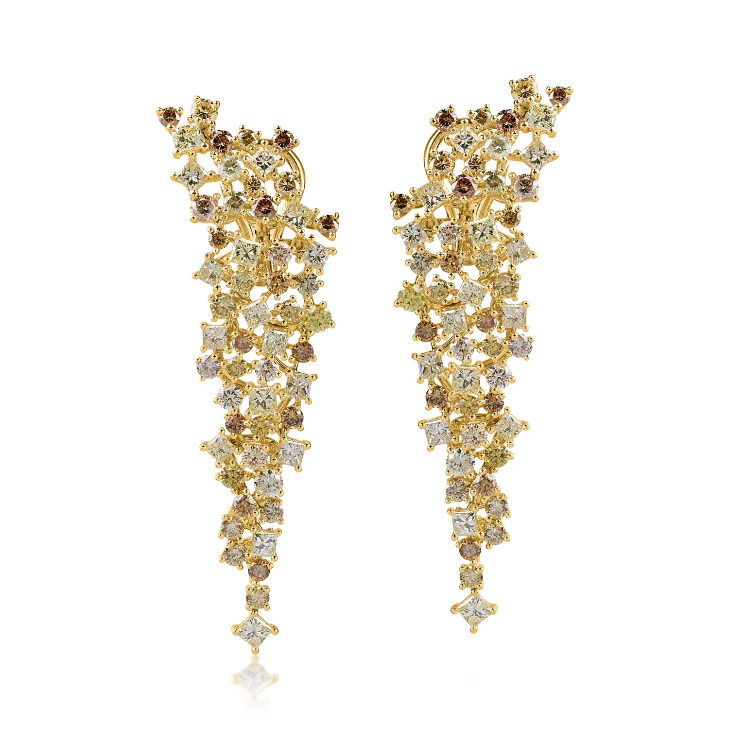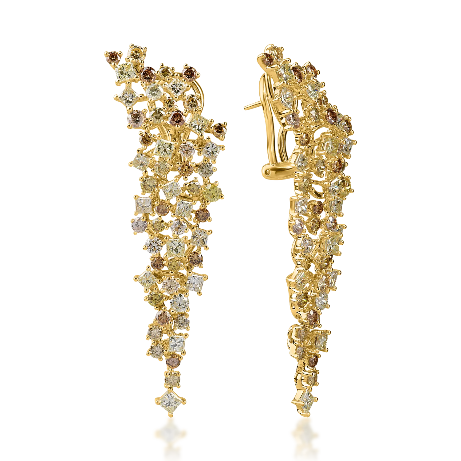 Cercei lungi din aur galben cu diamante multicolore princess si round de 6.2ct