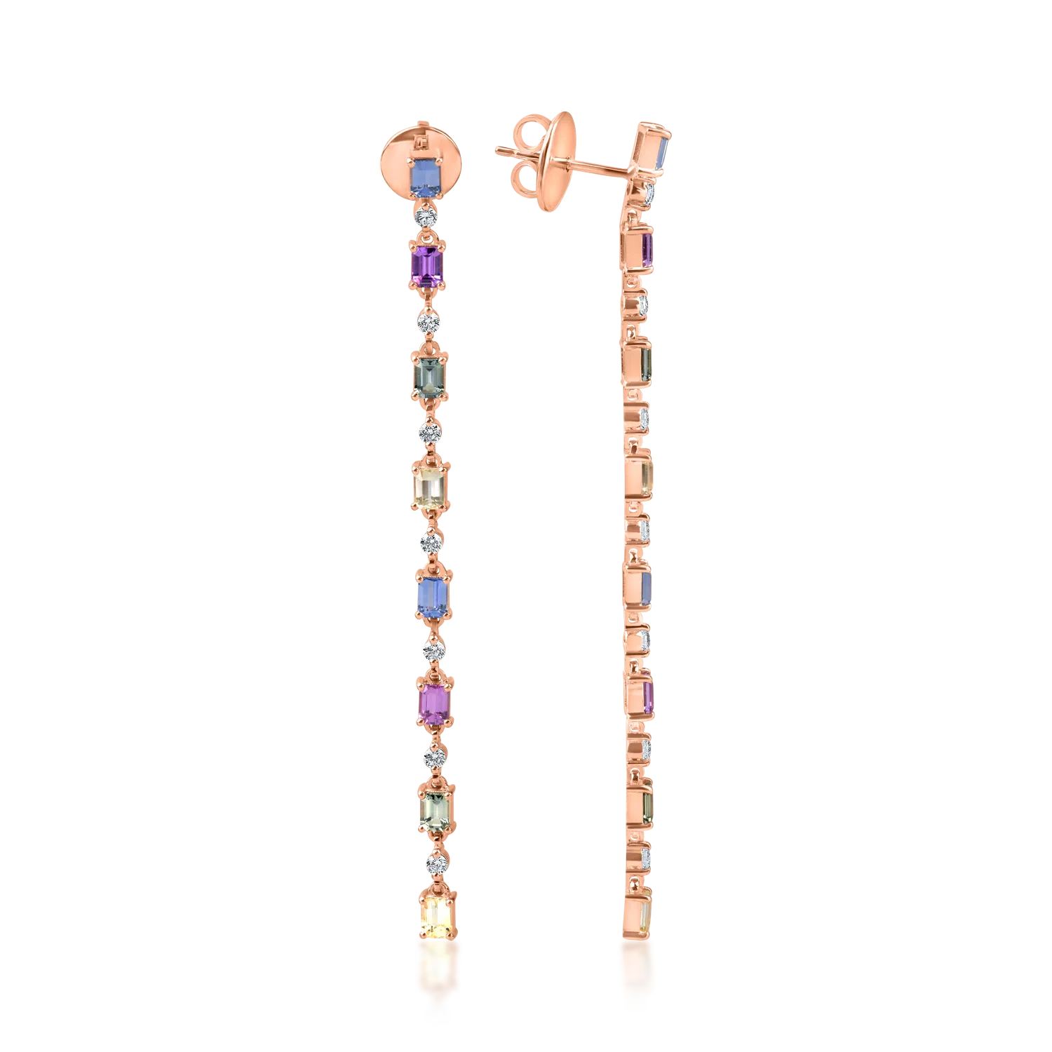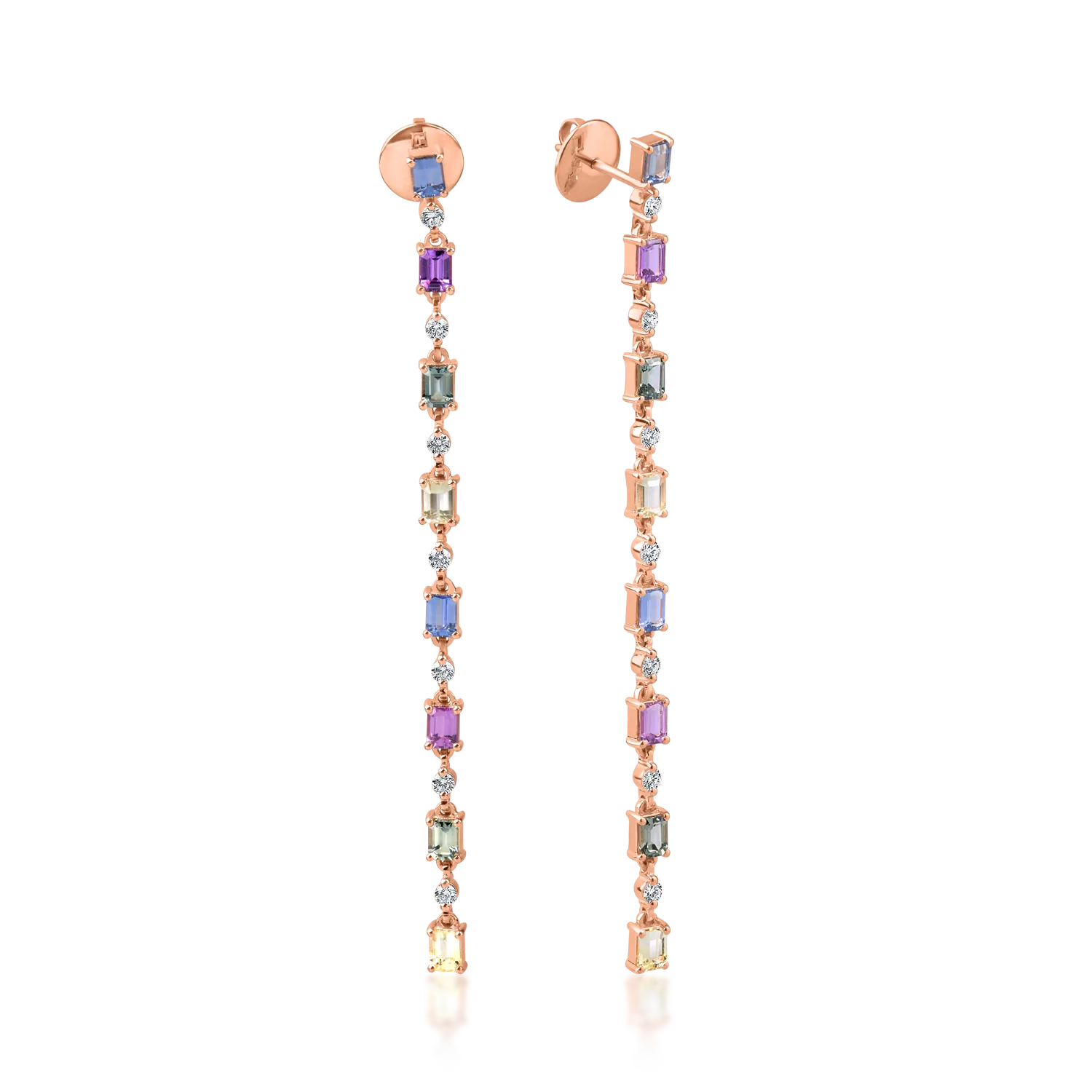 Cercei lungi din aur roz cu safire multicolore octogonale de 4.2ct si diamante de 0.5ct