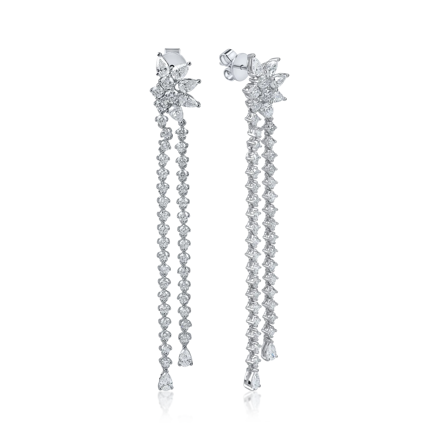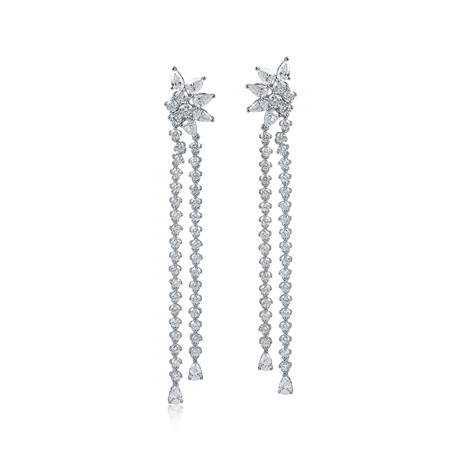 Cercei lungi floare din aur alb cu diamante pear si round de 3.4ct
