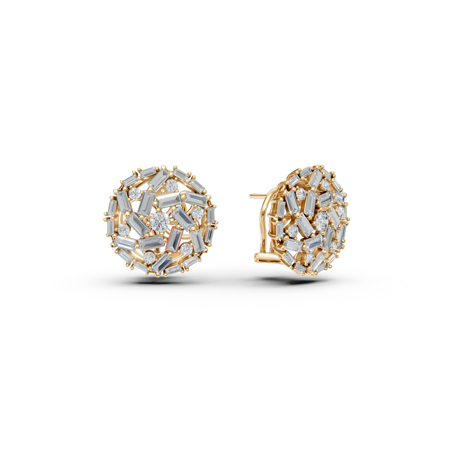 Cercei rotunzi din aur galben cu diamante baguette si rotunde de 2.1ct