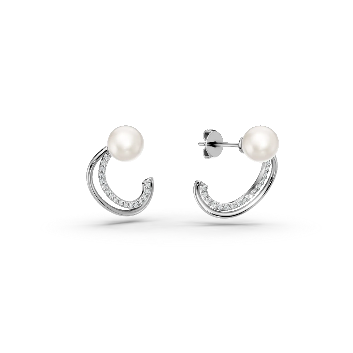 Cercei semiluna din aur alb cu zirconia si perle sintetice