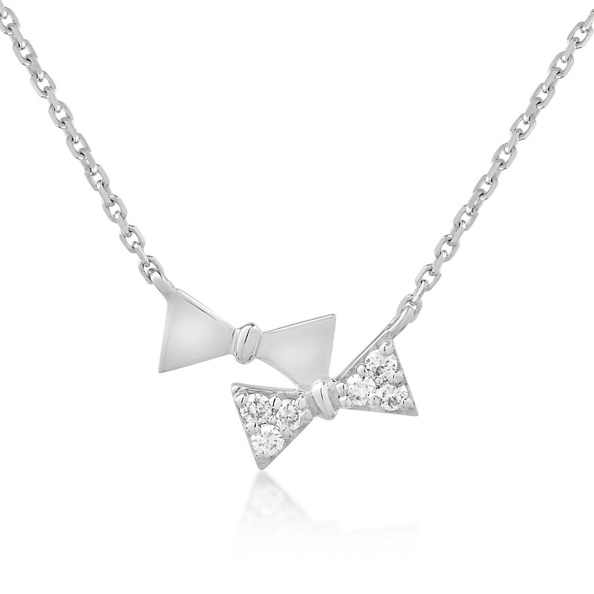 Exploreaza toate fatetele frumusetii. Un design rafinat, detalii minutioase si pietre pretioase, imbinate armonios in acest colier cu fundite din aur alb cu diamante de 0.052ct. O bijuterie care imbina gratie si echilibru, inspirata de feminitatea moderna si de eleganta clasica. Fiecare detaliu al colierului reflecta atentia pentru frumos si dorinta de a crea piese care sa te insoteasca in cele mai frumoase momente. Redescopera-ti energia debordanta cu bijuteriile TEILOR!