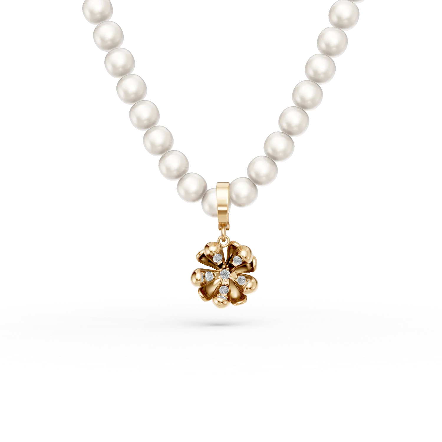 Colier cu pandantiv floare de tei din aur galben cu diamante de 0.08ct si perle de cultura