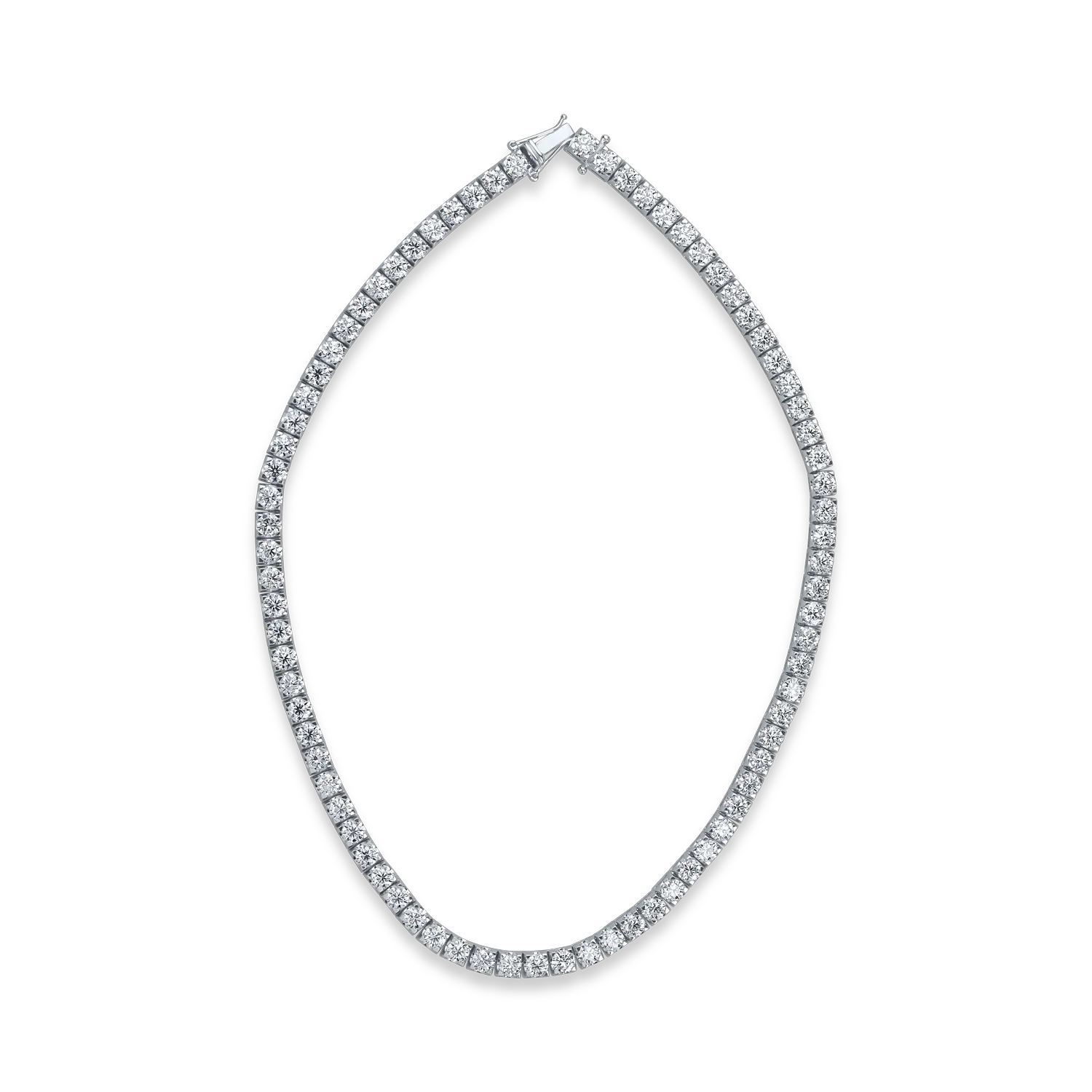 Fii fermecatoare fara prea mult efort si lasa perfectiunea sa iti lumineze aparitia. Acest colier tennis din aur alb cu diamante de 31.66ct este o capodopera a rafinamentului pur. Fiecare diamant, atent selectat pentru claritate si stralucire, reflecta lumina intr-un spectacol de eleganta si echilibru. Aurul alb pune in valoare intensitatea pietrelor, conturand o bijuterie ce emana forta si gratie. Este mai mult decat un simbol al luxului – este expresia feminitatii in forma sa cea mai sofisticata. Mai mult decat un accesoriu de efect. Mai mult decat o simpla bijuterie!