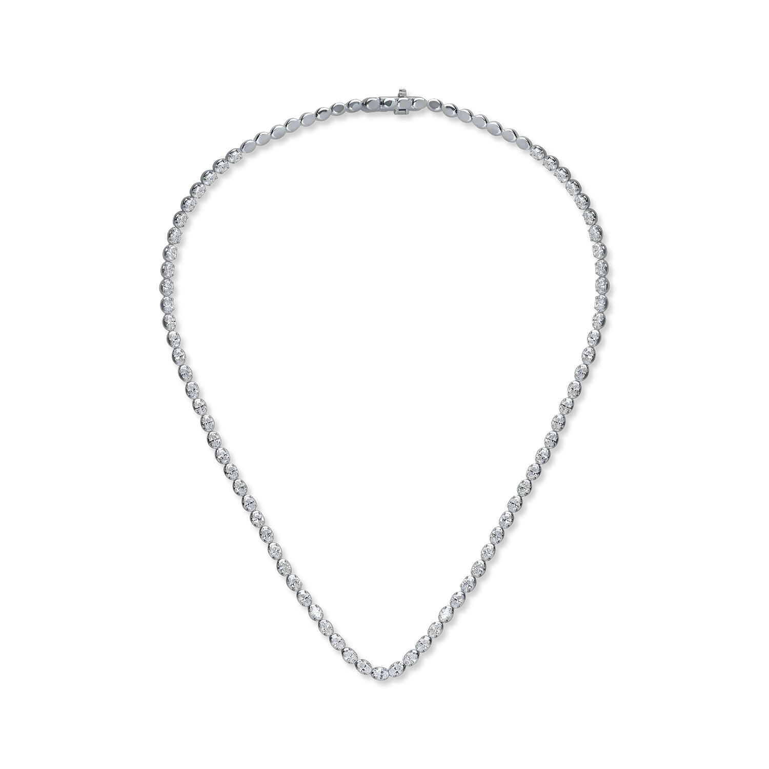 Gratie si frumusete – toate aceste elemente se reflecta in stralucirea pura a acestui colier tennis din aur alb cu diamante de 9.6ct. Designul sau rafinat imbina armonios luminozitatea metalului cu reflexiile intense ale diamantelor, slefuite pentru a dezvalui o stralucire spectaculoasa. Este o bijuterie care transforma eleganta intr-o forma de arta si adauga un plus de rafinament oricarei tinute. Un simbol al feminitatii atemporale si al bunului gust. TEILOR – bijuterii create in numele frumusetii!
